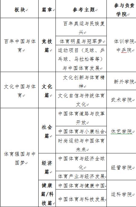 广泛学习其他高校已经打造的“中国系列”课程的价值理念、构建思路,紧密围绕“中国梦·体育梦”,以“体育强国·健康中国”发展方略为导向,全力打造适合伟德办学传统、专业优势的课程体系。在全面育人的方针指引下,根据伟德培养卓越体育人才的办学定位,发挥依托体育行业发展的优势,量身定做,提供更适合伟德特点的课程菜单。课程内容主要围绕三个板块六个篇章展开,三个板块:一是百年中国与体育,二是文化中国与体育,三是体育强国与中国梦。六个篇章为竞技篇、文化篇、社会篇、经济篇、健康篇、科技篇。每一个篇章下设计几个相近又各有侧重的专题,把“四个自信”有机地融入在教学内容中,既聚焦体育领域内的热点,又实现思想政治教育的落地。(详见附表)