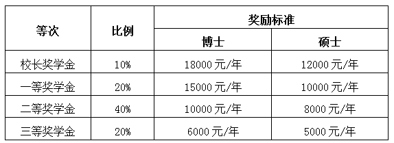 2017级新生学业奖学金根据入学招录成绩排名评定相应等级。提前攻博、申请审核制入学的博士研究生第一学年享受一等奖学金,推荐免试的硕士研究生第一学年享受一等奖学金。2017级新生学业奖学金评定工作由研究生招生工作办公室负责,按比例划分名额,在学生入校获得正式学籍后发放。奖学金等级及奖励标准如下: