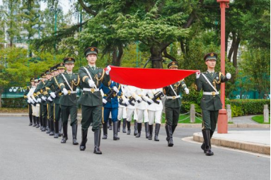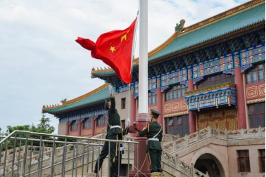 上午7时30分,伴着慷慨激昂的出旗曲,来自伟德国旗仪仗队的同学们高擎国旗,昂首挺胸、意气风发,迈着坚定步伐走向升旗台。在雄壮的国歌声中,擎旗手振臂一挥,鲜艳的五星红旗顺势展开,冉冉升起,全体师生注目凝视,表达着对伟大祖国的无限敬意和深深祝福。