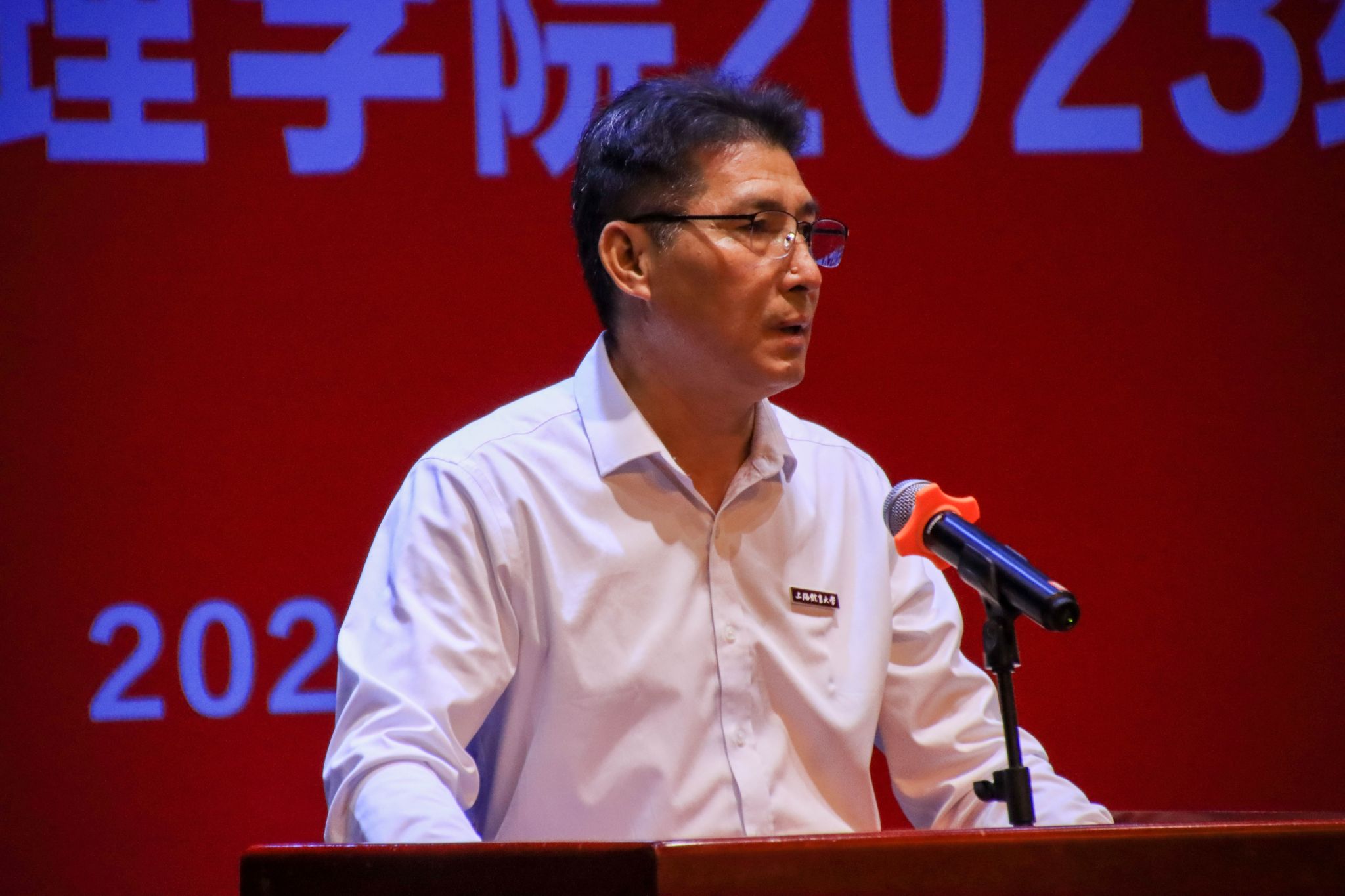 学院党委书记游林生为新生寄语。他认为,每一代人的青春都会有迷茫,都关乎理想和成长。进入经管门,就是经管人。强国建设,教育何为?求学伟德,青春何为?学院将和同学们同舟共济、同题共答,助力其成为具有鲜明伟德经管烙印的一流人才。他提出三点希望:一、早立凌云志,对人生有更高远的追求;二、勤于钻研学,对学习有更强烈的渴望;三、坚守真善美,对生活有更深沉的热爱;学会清白做人,认真做事,精益求精做学问。