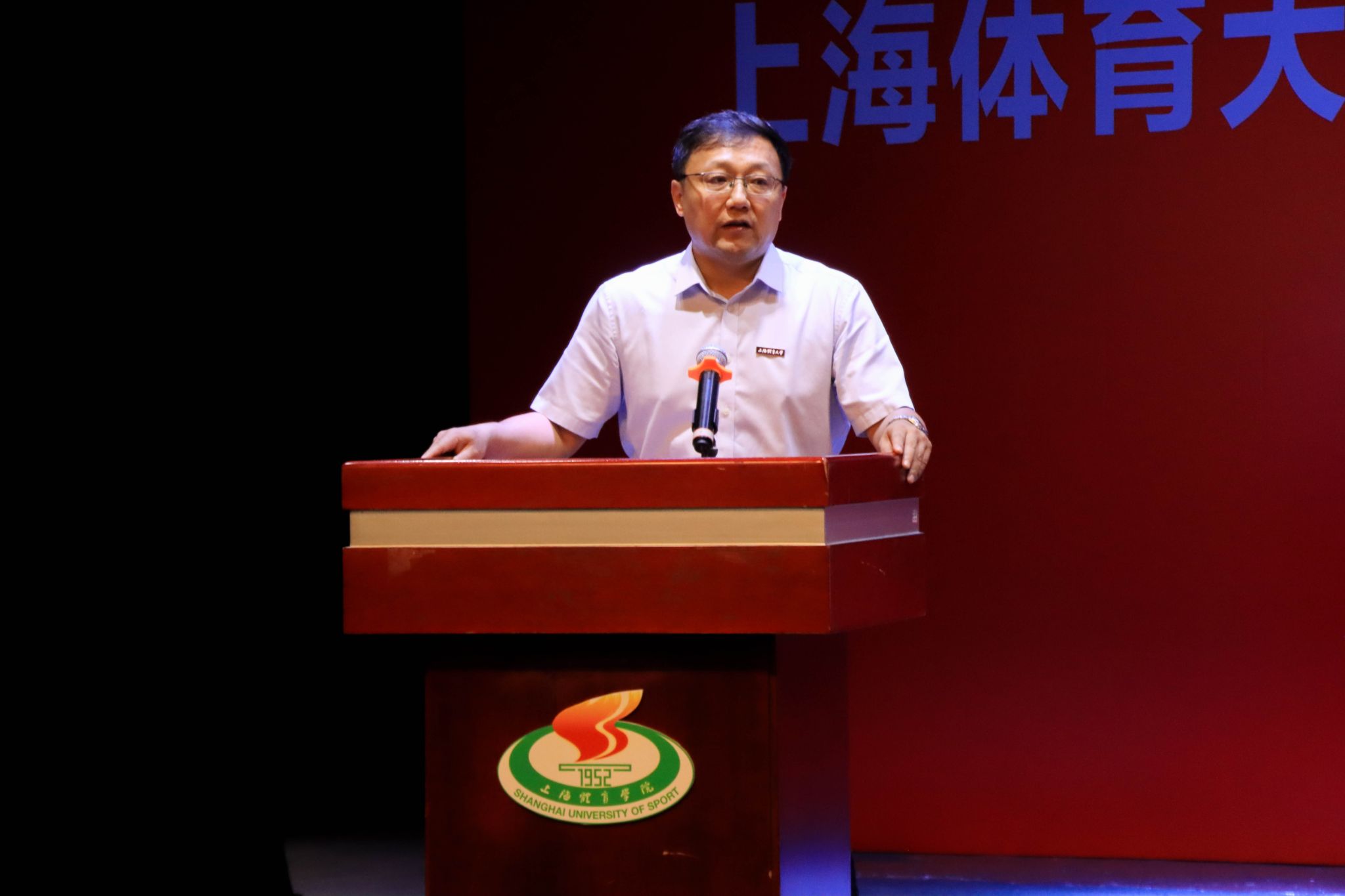 校友代表2008届市场营销本科毕业,目前负责亚运会以及亚残运会部分赛事体育展示和颁奖仪式的上海峥唐体育科技有限公司总经理江波、2018届体育管理硕士毕业五年全程参与亚运会筹办工作的冯喆春通过视频表达了对新生的期望和对学院的深切祝福。