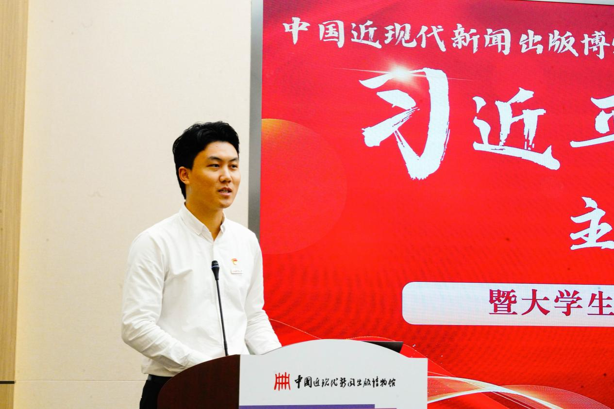 “新传青年说”环节,新闻与传播学院研究生党员陈鑫隆为同学们展示了2023年上海市高校青年演讲大赛银奖作品:以青春力量谱写时代华章。