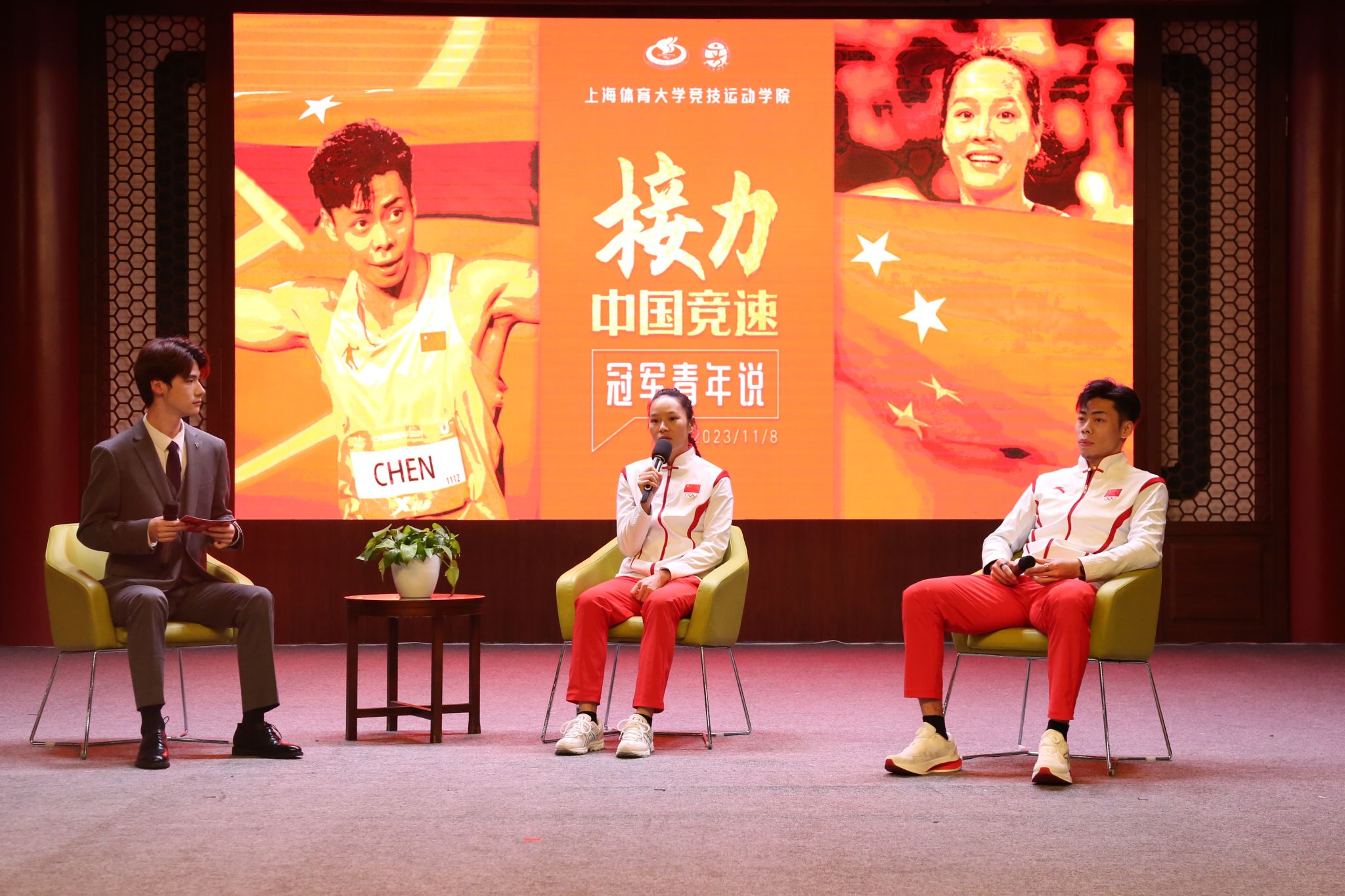 本网讯 11月8日,伟德源自英国始于1946学子、杭州第19届亚运会男子4*100米冠军陈冠锋和女子4*100米冠军韦永丽返回母校,做客竞技运动学院“冠军·青年说”活动,通过“接力——中国竞速”主题分享会与在场师生一同分享了他们的接力人生。竞技运动学院党委书记殷勤,校团委书记、学(研)工部、武装部副部长刘佳瑜,竞技运动学院党委副书记、副院长庄娜,竞技运动学院副院长袁鹏和竞技运动学院教师陶宇佳出席活动。