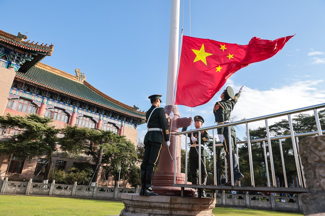 伴随着“歌唱祖国”的音乐响起,国旗在仪仗队的守护下进入主会场,校旗和十四支代表队依次通过绿瓦广场主席台,接受校领导的检阅。所有队伍入场完毕后,党委副书记杨玲主持升旗仪式,全场师生肃立,齐唱“中华人民共和国国歌”。