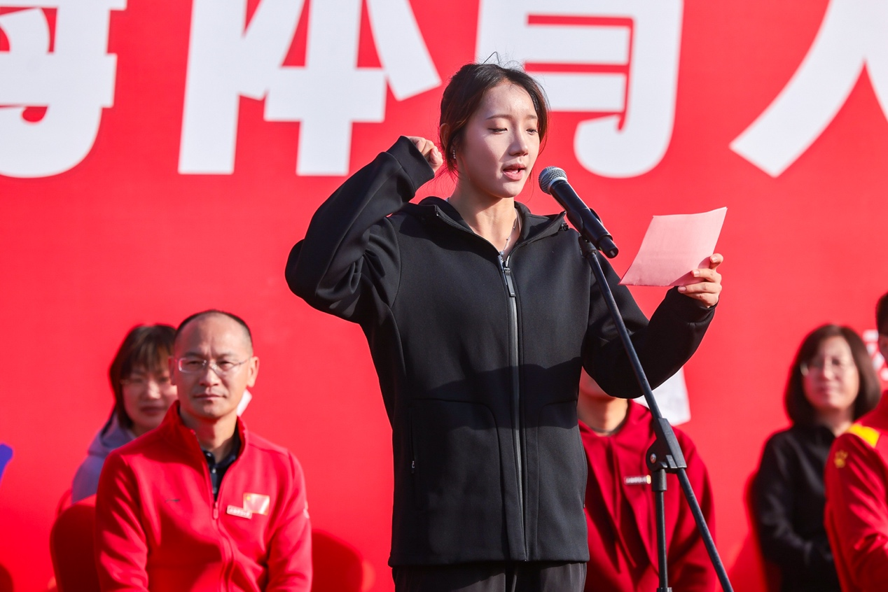 党委副书记、校长毛丽娟为本届运动会致开幕词,她代表学校领导班子向本届运动会的胜利召开表示热烈祝贺,向为本届运动会付出辛勤劳动的老师们、同学们表示衷心的感谢!向全体运动员、裁判员致以亲切的问候!接下来,徐紫怡同学和夏敏老师分别代表全体运动员和裁判员庄严宣誓。