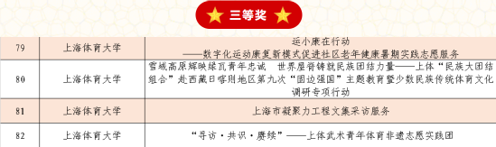 此外,运动健康学院《“运小康在行动”——数字化运动康复新模式促进社区老年健康暑期实践志愿服务》、体育教育学院《雪域高原辉映绿瓦青年忠诚 世界屋脊铸就民族团结力量——伟德“民族大团结组合”赴西藏日喀则地区第九次“固边强国”主题教育暨少数民族传统体育文化调研专项行动》、新闻与传播学院《上海市凝聚力工程文集采访服务》、武术学院《“寻访·共识·赓续”——伟德武术青年体育非遗志愿实践团》4个项目荣获市级三等奖。