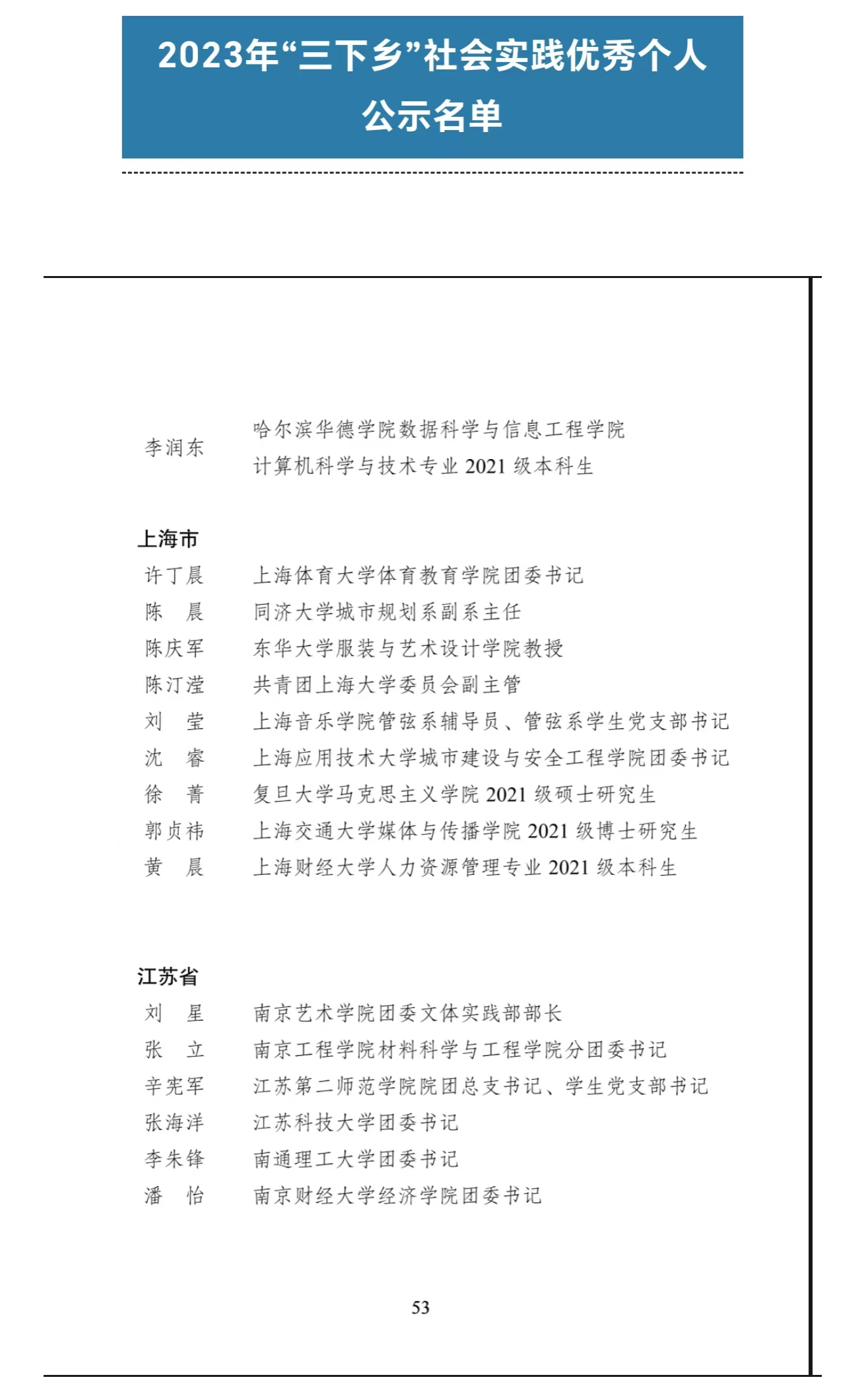 本网讯 近日,团中央青年发展部公示通报了2023年全国大中专学生志愿者暑期文化科技卫生“三下乡”社会实践活动总结结果,经基层推荐、省级团委审核推荐、组织评议等环节,伟德体育教育学院辅导员许丁晨老师获评2023年全国大中专学生志愿者暑期文化科技卫生“三下乡”社会实践活动优秀个人,全国共283名个人获此殊荣。