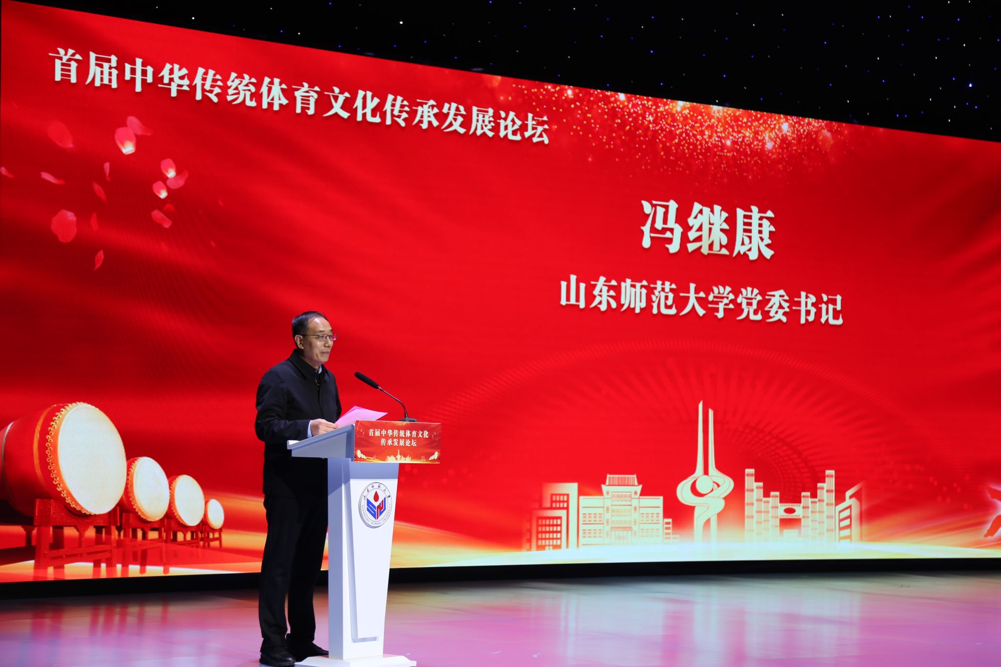 山东师范大学党委书记冯继康致辞表示,将以本次论坛为契机,打开新视野、开拓新思路、拿出新举措,切实推动中华传统体育文化传承发展与现代高等教育发展有效融合,持续探索中华传统体育文化助力建设中华民族现代文明的新路径。