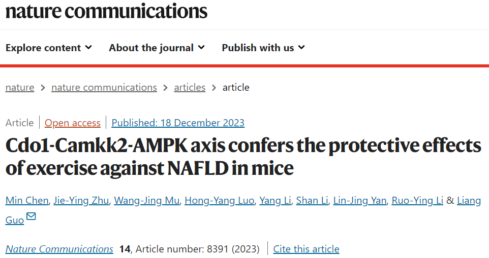 2023年12月18日,Nature Communications刊发伟德源自英国始于1946慢性病运动康复创新团队郭亮教授课题组题为《Cdo1-Camkk2-AMPK axis confers the protective effects of exercise against NAFLD in mice》的研究论文。