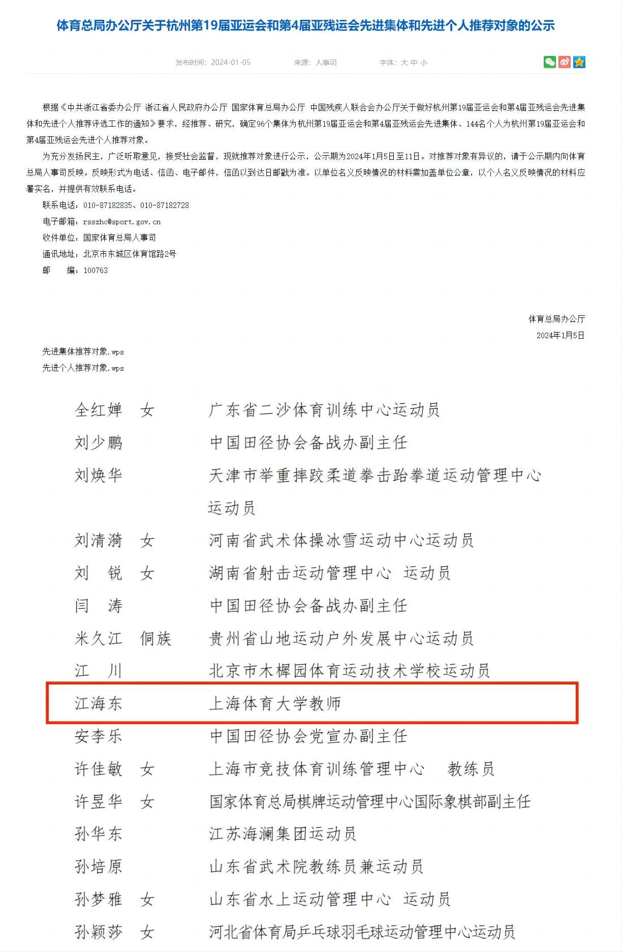 本网讯 日前,国家体育总局人事司发布《体育总局办公厅关于杭州第19届亚运会和第4届亚残运会先进集体和先进个人推荐对象的公示》,伟德武术学院江海东老师获评杭州第19届亚运会“先进个人”荣誉称号。去年9月,在杭州第19届亚运会男子散打56公斤级决赛中,江海东凭借着敢于拼搏、奋勇争先的赛场精神,为中国代表团夺得了金牌,在亚运赛场上实现了为国争光、为校争荣。