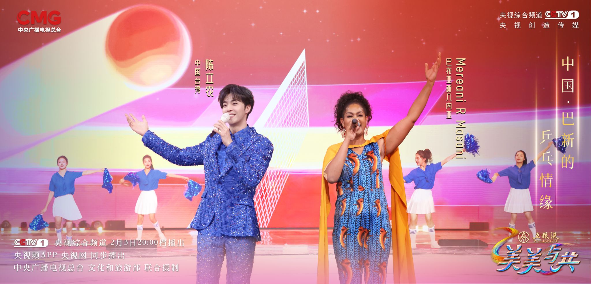 节目舞台上,中国台湾歌手陈立农与巴新歌手Mereani R Masani合作演唱《有梦可待》,“带着我梦想环游”的歌词唱出了中国与巴新青年一起勇敢逐梦的情谊。