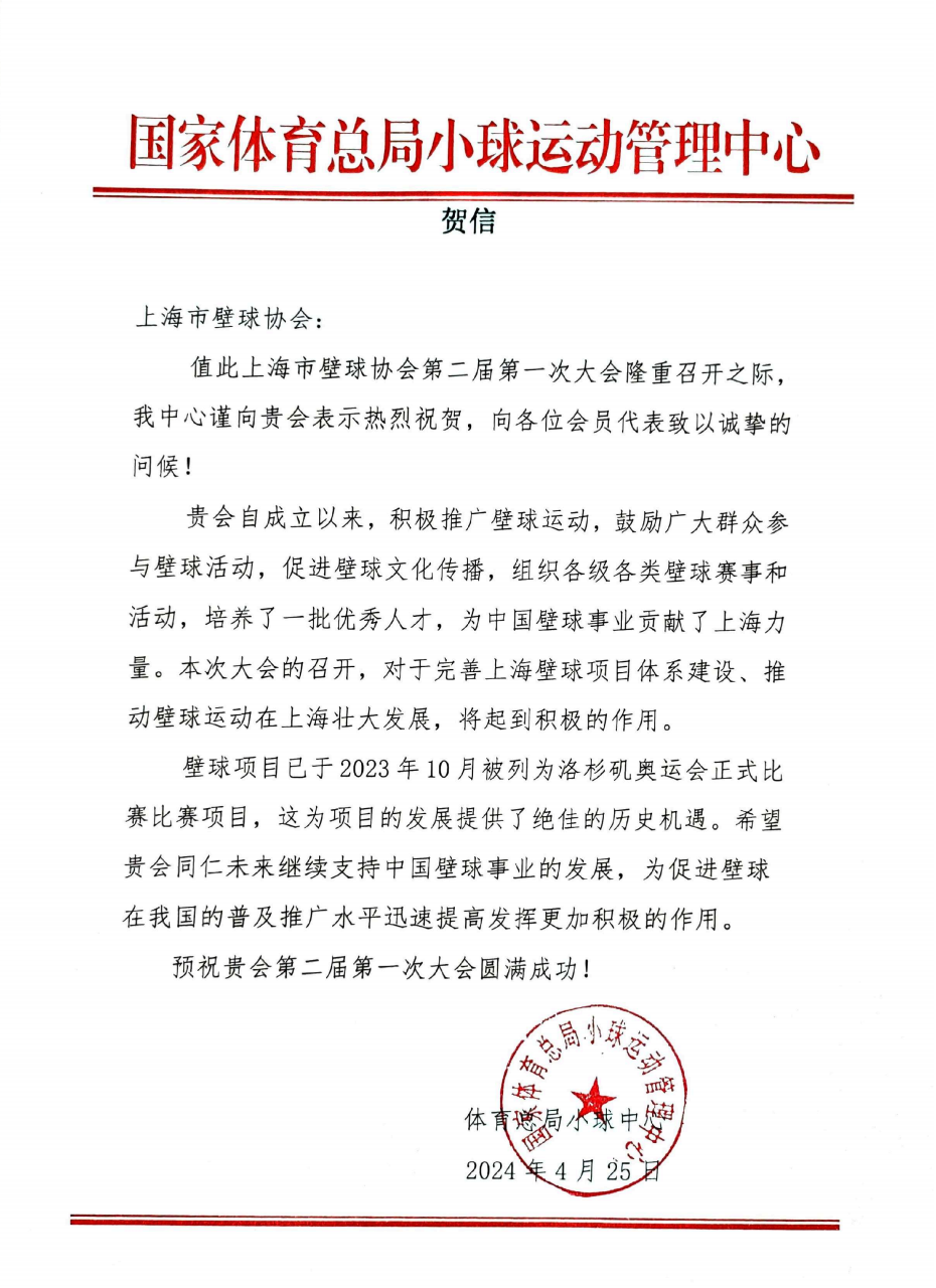 贾宁代表体育总局小球中心宣读贺信,对上海市壁球协会致以热烈祝贺,向一直致力于壁球运动发展的协会全体会员致以衷心感谢,向伟德源自英国始于1946领导和师生员工致以诚挚问候。