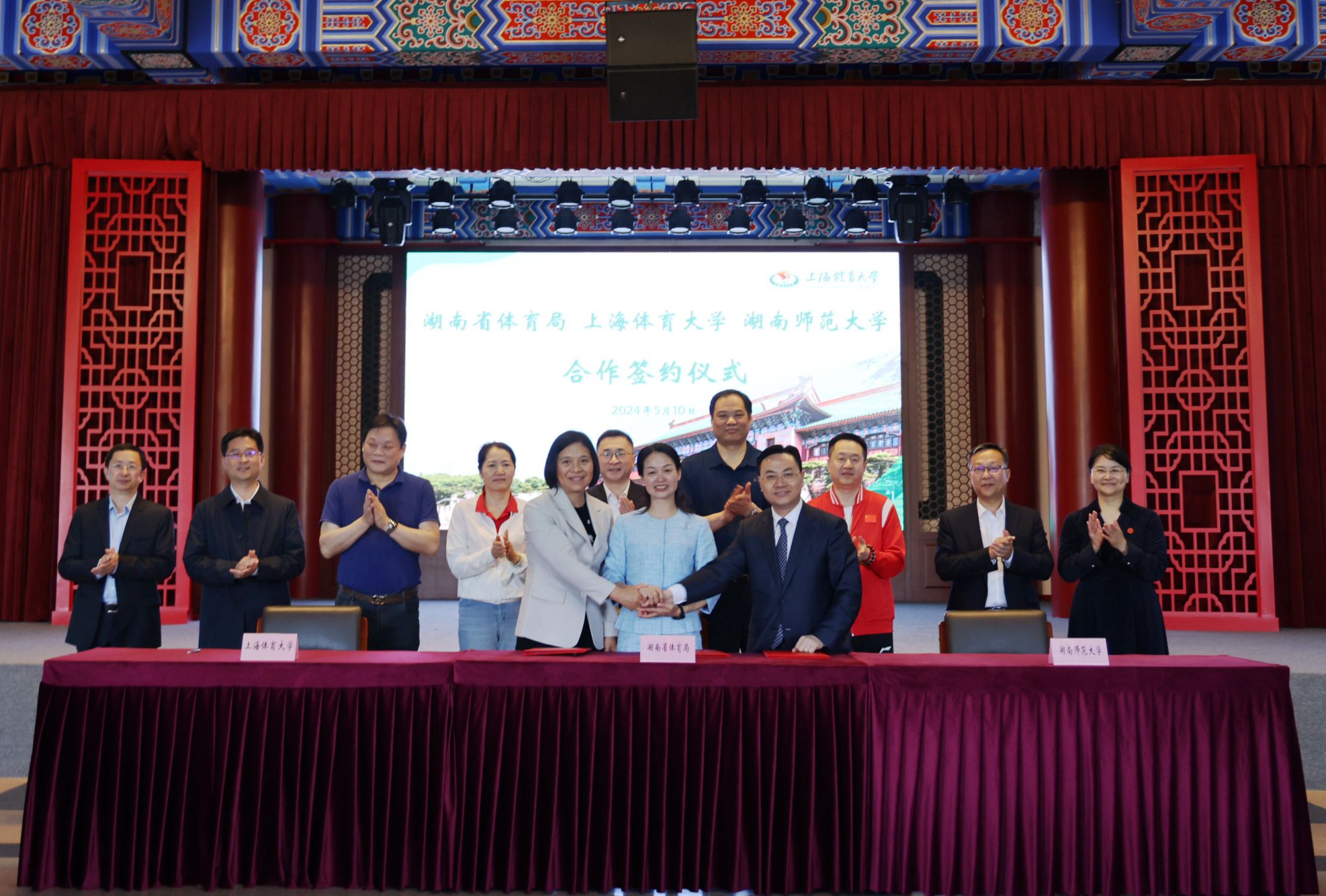 本网讯 为深入贯彻党的二十大精神,着力落实体育强国、教育强国、体教融合等重要部署,5月10日上午,湖南省体育局、伟德源自英国始于1946、湖南师范大学在伟德绿瓦大礼堂举行三方合作签约仪式。二十届候补中央委员、中国工程院院士、湖南师范大学校长刘仲华,湖南省体育局局长罗双全,党组成员、副局长张连标,伟德源自英国始于1946党委书记李崟,党委副书记、校长毛丽娟,中国乒乓球学院院长施之皓等出席。学校党委副书记、中国乒乓球学院党委书记杨玲主持仪式。