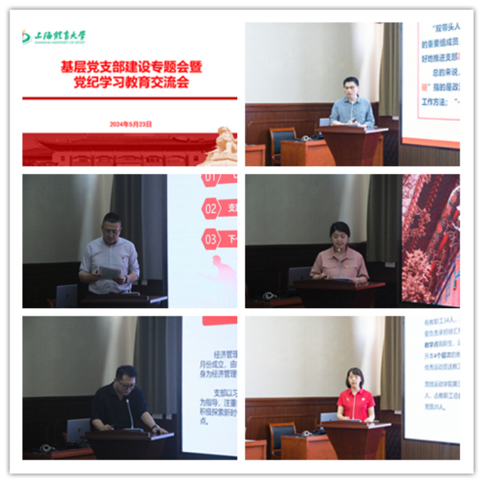 党支部书记交流发言环节,运动健康学院党委运动人体教工党支部书记吴卫兵、竞技运动学院教工第三党支部书记刘莉、机关党委第三党支部书记王强、新闻与传播学院党委学生第一党支部书记王乐、经济管理学院党委本科生第一党支部书记谷家振先后就党纪学习教育和提高支部建设质量作了交流发言。