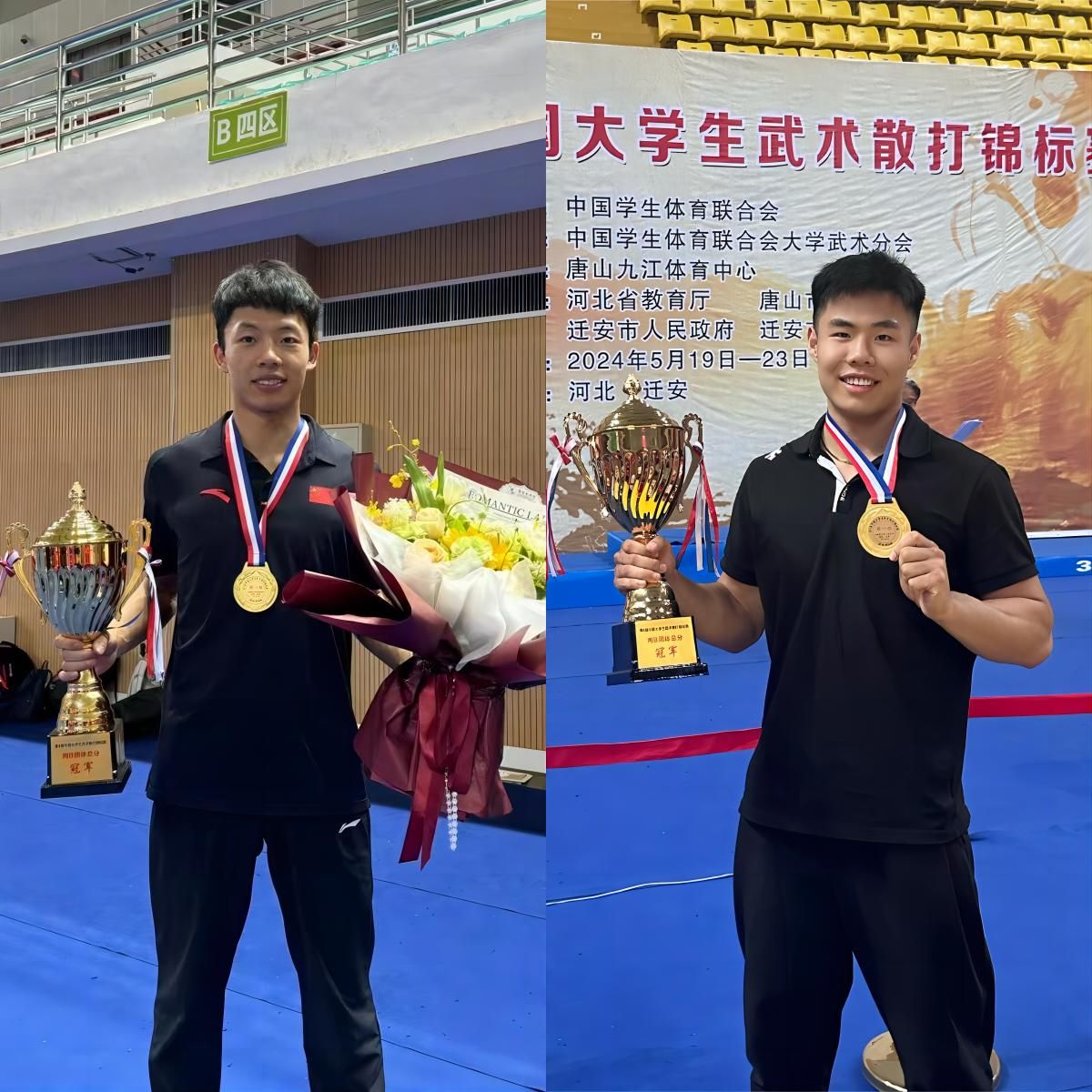 比赛中,我院武术与民族传统体育专业2022级散打专项班魏子昂同学和2021级散打专项班王卓同学,发挥出色,在激烈角逐中脱颖而出,分别获得男子丙B组75公斤级冠军和男子丙B组85公斤级冠军,并成功获得了代表国家队征战第一届亚洲大学生武术锦标赛的参赛资格。