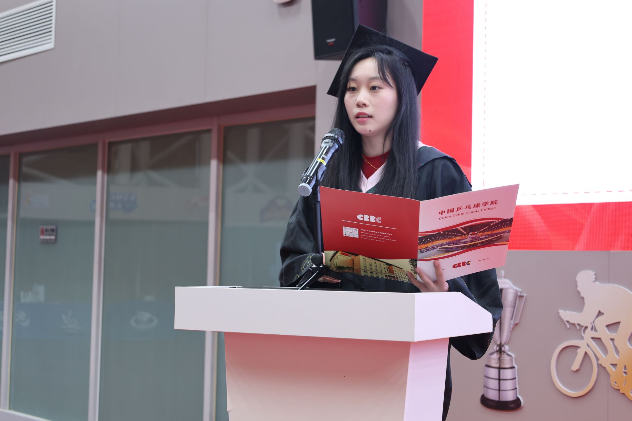 2024届毕业生代表朱辰文回忆了本科四年求学期间在中乒院的成长体会和收获。她说道:“作为新时代的青年学子、新时代的乒乓人,我们定不负时代、不负韶华,成为新时代奋勇前进的搏击者和传承乒乓精神的新青年,带着母校的期望和老师们的教诲砥砺前行,以青春之名赴时代之约。”
