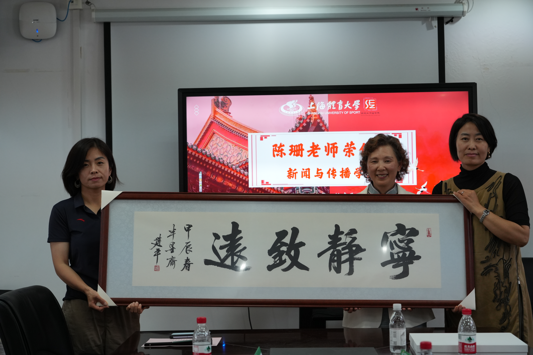 郑国华为陈珊老师颁发荣休证书,高艳丽和张瑞青代表学院将“宁静致远”书法牌匾赠予陈珊老师,学生们为陈珊老师送上了悄悄准备的视频和相册。这不仅是对陈珊老师过往辛勤耕耘的认可,更是对尊师重道精神的传承,对其未来人生旅程的美好祝福。陈珊老师接过学院师生们精心准备的礼物时,潸然泪下。