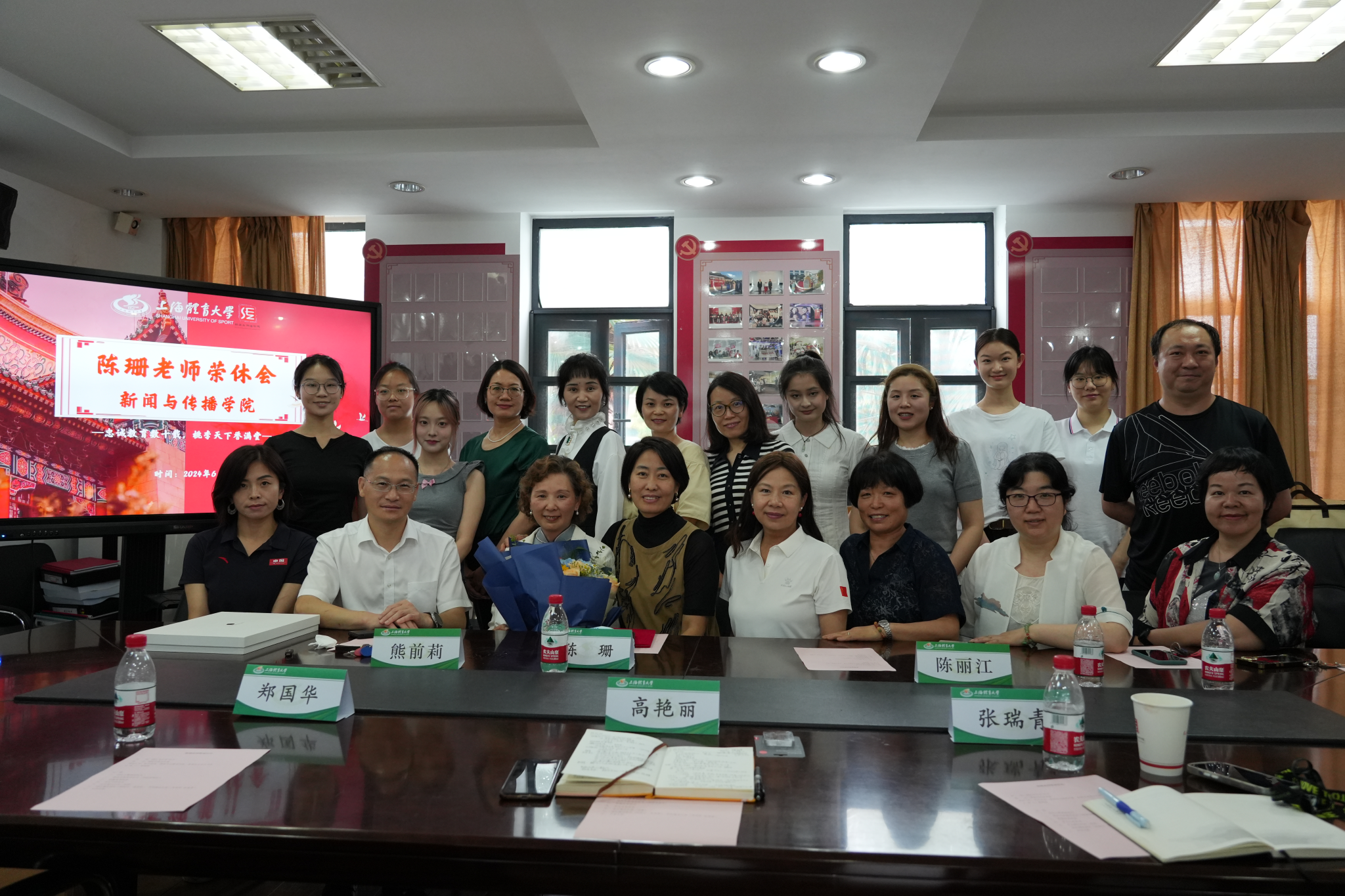 本网讯 为加强教师思想政治引领,传承优良师德师风,6月19日下午,新闻与传播学院为退休教师陈珊举行了温馨的荣休仪式。新闻与传播学院党委书记高艳丽,副院长(主持工作)郑国华,党委副书记、副院长张瑞青,英语专业负责人陈丽江,团队负责人熊前莉等英语专业团队老师及学生代表出席。会议由党委书记高艳丽主持。