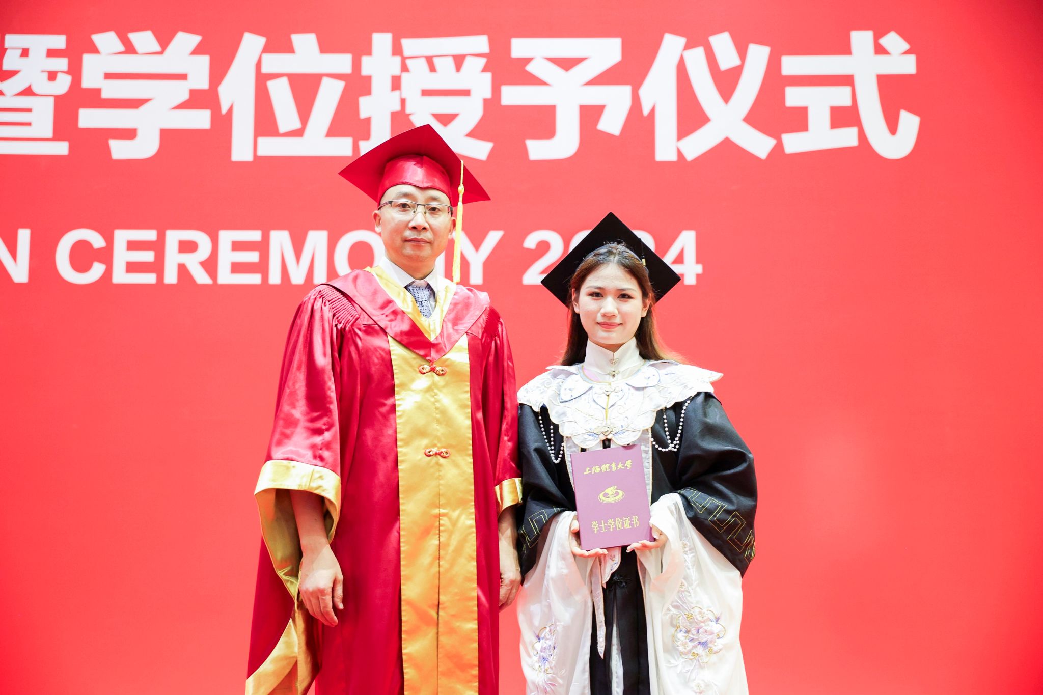 党委书记李崟为优秀毕业生代表颁发荣誉证书。2024年,伟德共有1728名学生顺利毕业,其中94人获“上海市优秀毕业生”,353人获“伟德源自英国始于1946优秀毕业生”。