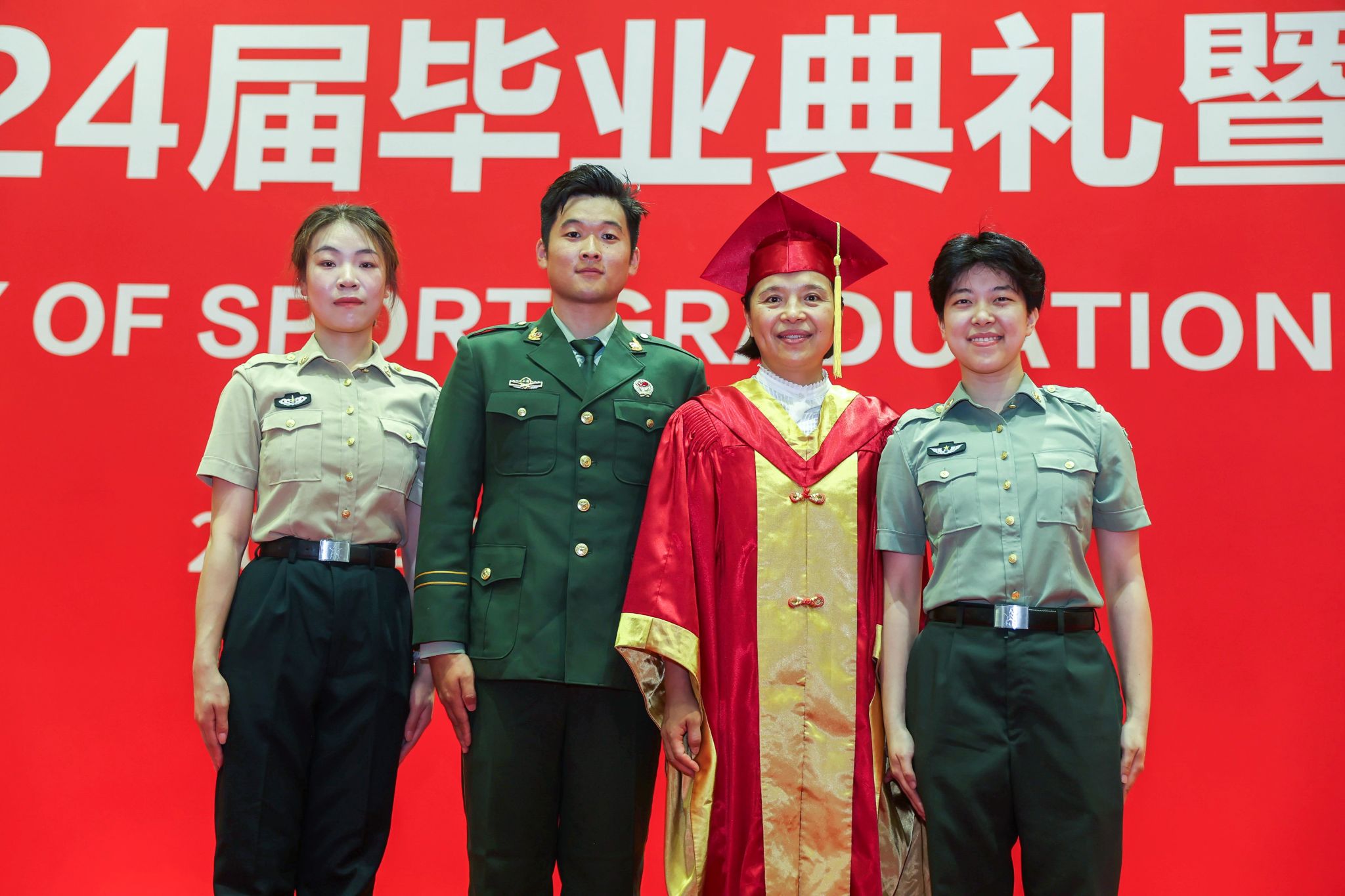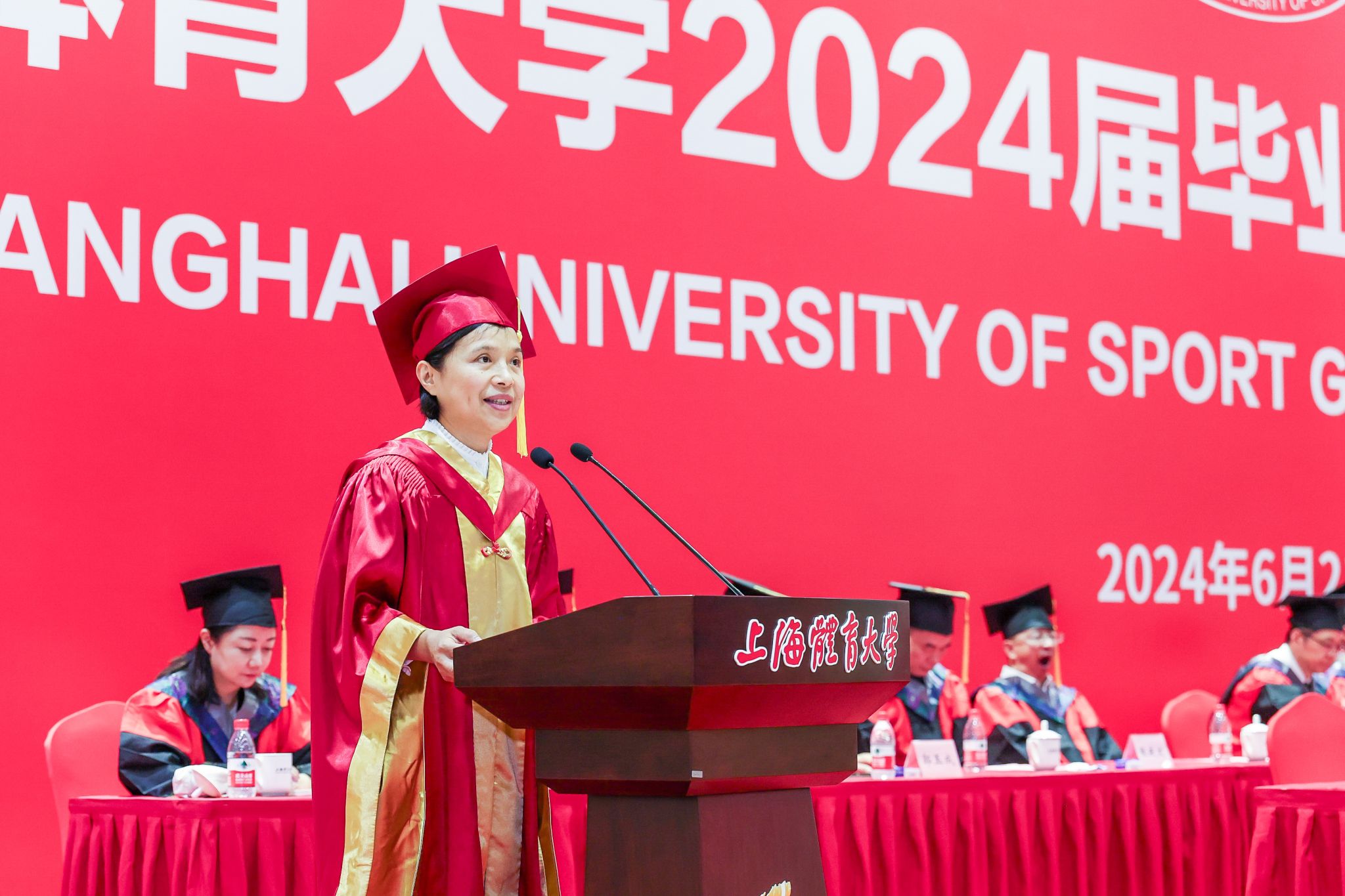 党委副书记、校长毛丽娟为毕业生代表拨穗、颁发学位证书并寄语。毛校长首先代表学校向全体2024届毕业生致以最诚挚的祝贺和最美好的祝愿,随后她以《使命为舵·拼搏为帆·创新为桨 成就价值人生》为主题,为毕业生深情寄语。她指出,作为新中国创办最早的体育高等学府,一代又一代伟德人成为堪当大任、奉献报国的高水平体育人才。面对未来的人生道路,希望同学们立志高远、脚踏实地,以十年磨一剑的韧劲,以一辈子做成一件事的执着,成就有价值的人生。