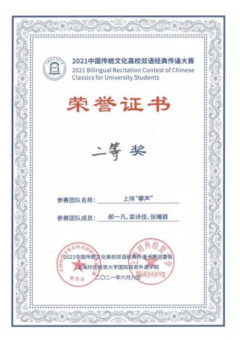 郝一凡、梁诗佳、张曦颖在2021中国传统文化高校双语经典传诵大赛中获二等奖