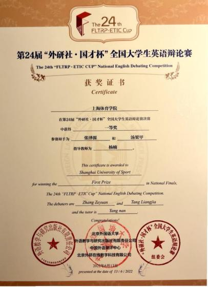 汤梁甲、张泽源获第24届“外研杯· 国才社”全国大学生英语辩论赛一等奖