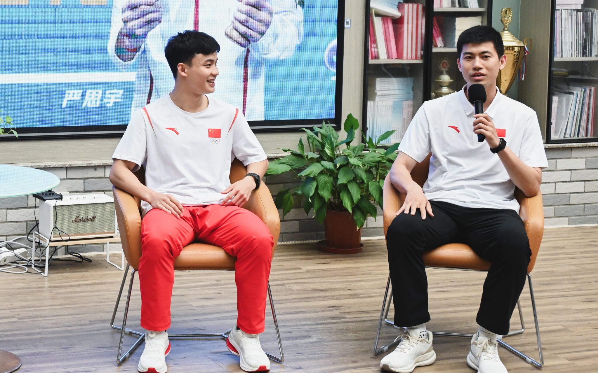 活动现场播放了严思宇的亚运会夺冠视频,视频中他与搭档动作整齐划一,在空中完成高难度的翻转和抱膝动作,随着最后一跳入水,又一枚金牌收入中国代表队囊中,再次捍卫了梦之队的荣耀。在这荣耀称号背后,是无数中国跳水人一代又一代的努力。“相信,相信的力量”,严思宇被问到第一次参加国际比赛是否紧张时,他的坚定回答。他表示紧张在所难免,所以要多将注意力转移到自身,专注于自己的热身情况,让四肢充分伸展,这样能缓解一些紧张情绪,最重要的就是相信自己!相信自己能做到!