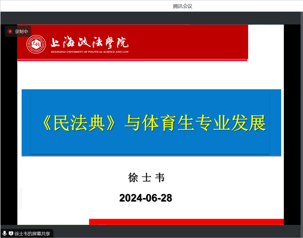 6月28日晚,学校邀请上海政法学院体育法治研究院副院长、涉外法治研究院研究员,国家体育总局青少年体育战略研究组成员、《中华人民共和国体育法》修订组成员徐士韦教授举办线上民法典专题讲座。讲座中,徐教授从民法典颁布的历史意义谈起,详细介绍了民法典中与体育直接相关的法条条文。徐教授通过多个与体育法治紧密相关的案例分析,从学校体育、社会体育、竞技体育三方面围绕人格权编、合同编、侵权责任编中与体育法治相关的立法精神,重点分析讲解了体育领域如何保护民事主体合法权益、界定具体法律行为等方面的重要法条内容。对新修订的《体育法》的正确适用也作了深入阐释,进一步加深了同学们对民法典与体育法治的理解。