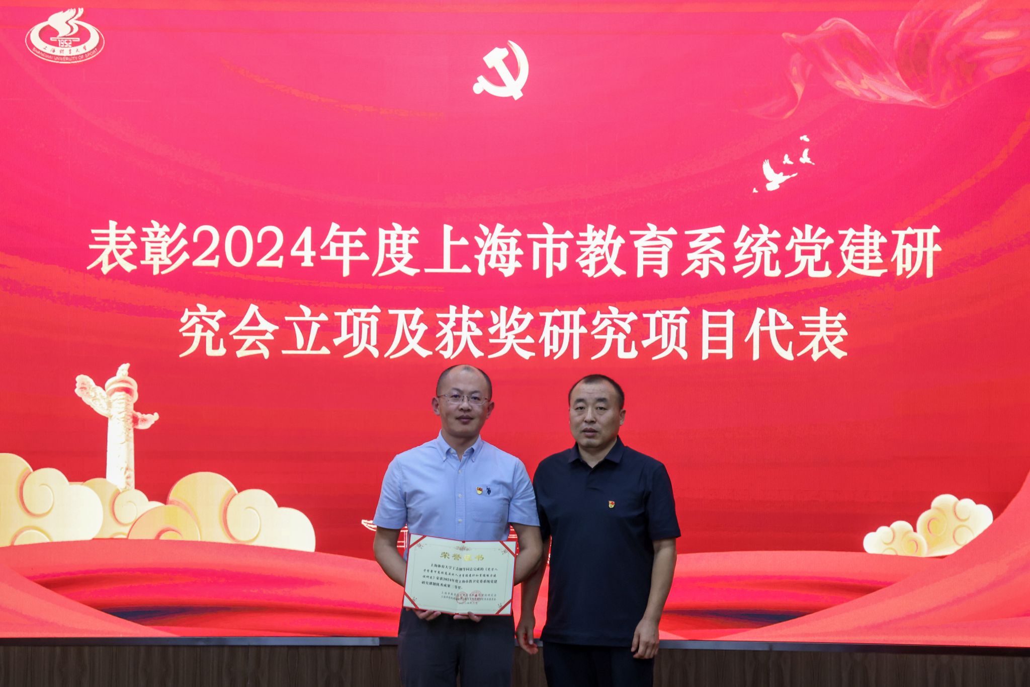 党委副书记王继红,党委副书记、纪委书记崔勇和副校长唐炎为获得2024年度上海市教育系统党建研究会立项及获奖研究项目颁发证书。