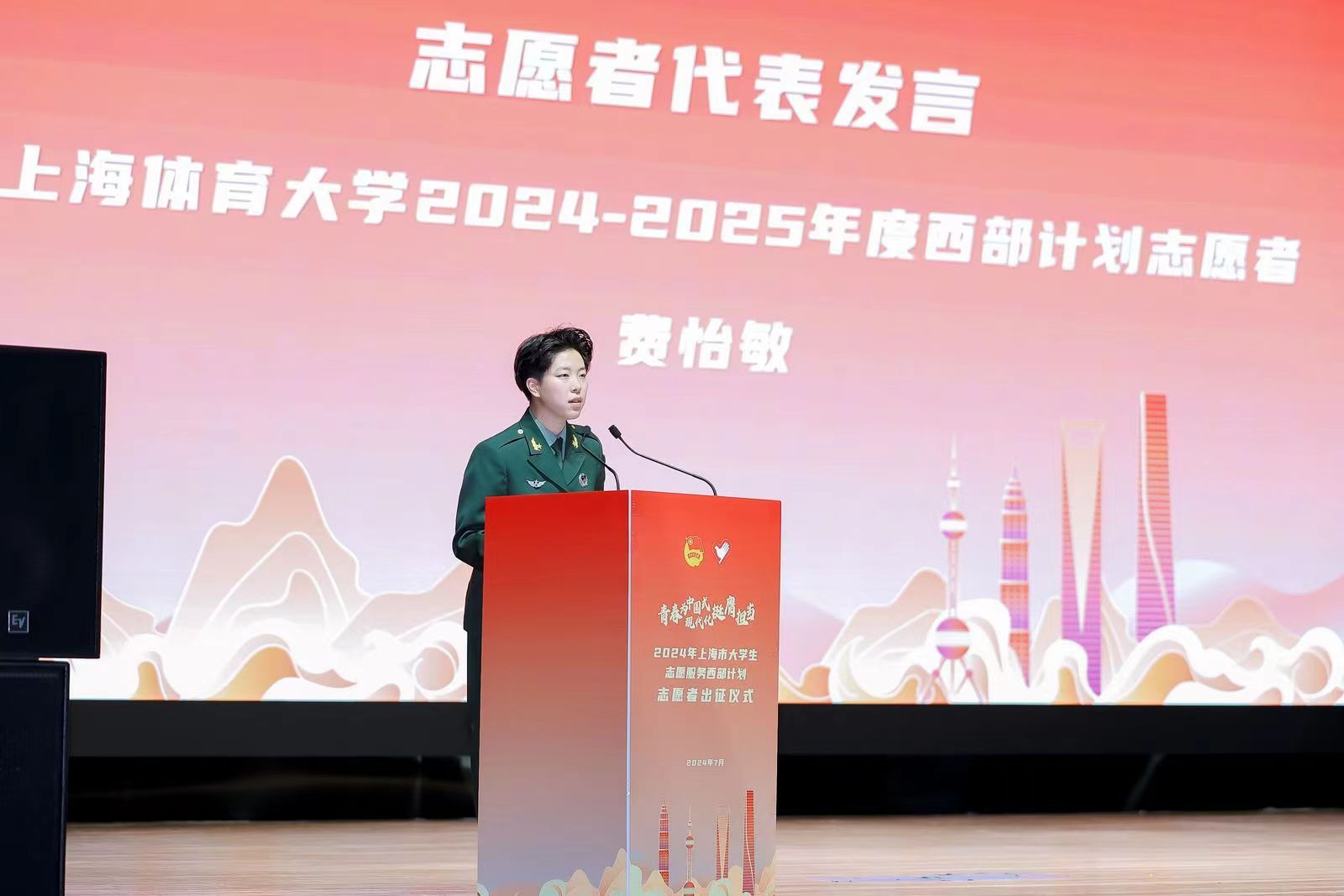 伟德费怡敏同学作为今年上海市西部计划志愿者代表在出征仪式上发言。作为上海人的她,在2021年本科就读期间,毅然选择参军入伍。在军营的严格训练和生活中,她深刻感受到了“军民鱼水情”的深厚情感和真挚关怀。这段经历不仅锻炼了她的意志,也丰富了她的人生体验。回到校园后,她又积极参与学校的各项工作,从武装部助管到助理辅导员,从军训教官到学生事务助理,用实际行动传递温暖与力量。今年,已经获得推免资格本可以在9月份入读研究生的她,再一次被“到西部去,到基层去,到祖国和人民最需要的地方去”的号召鼓舞,选择推迟入学,将西部计划作为实现人生价值、践行初心使命的最佳舞台。