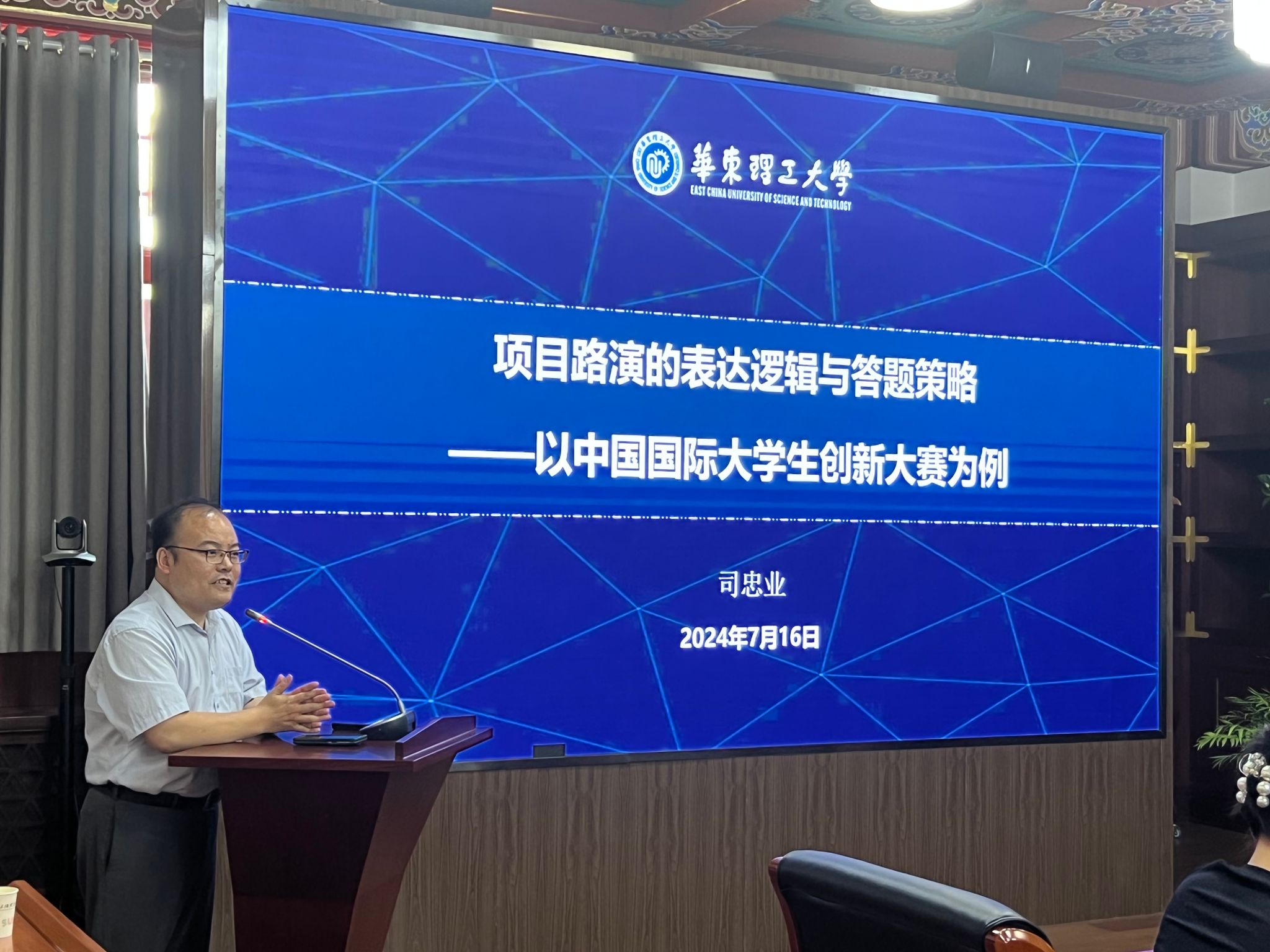 华东理工大学创新创业教育中心副主任司忠业以中国国际大学生创新大赛为例,从大赛目标:服务社会、增长才干、产教融合;路演任务:展示项目、触动评委、赢得共情;表达逻辑:事情很大、很急,我行、我独特;答题策略:胸有成竹、展示优势、适度锋芒四个方面向与会师生分享“项目路演的表达逻辑与答题策略”。