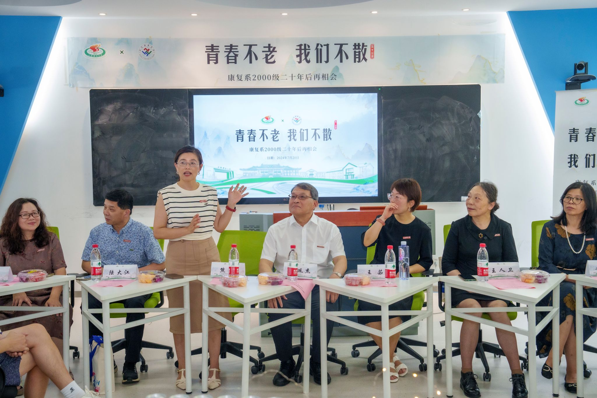 捐赠仪式结束后,举行了师生座谈交流会,学院党委书记熊静主持了这场意义非凡的座谈会,开场视频《二十年后我们来相聚》如同时光机,将所有人带回了那个充满梦想和活力的年代,一张张青涩的面庞,一串串欢快的笑声,唤起了在场所有人心中最柔软的记忆。学院党委副书记、院长王茹向校友们介绍了学院的辉煌成就和未来发展的宏伟蓝图,她的每一句话,都如同春风化雨,滋润着每一位校友的心田,副院长于新凯从办公室找出了康复系2000级《解剖学》点名册,回忆起当年自己与同学们的教学情景。在交流发言环节,校友们各自分享了毕业之后的人生经历和职业成长,毕业二十载,大家怀揣着“身心一统,兼蓄竞攀”的伟德人使命感,都已成长为各行各业的业务骨干。原康复系授课教师和辅导员都逐一发言,表示看到学生们成长成才是教师最幸福的事情。最后,陈佩杰教授高度赞扬了各位同学在各自领域取得的工作成就,并表达了学校一如既往对校友们的支持,同时也全面介绍了同学们离校后学校的发展历程、办学现状和校区规模,他的每一句话,都充满了力量和希望,激励着每一位校友继续前行。