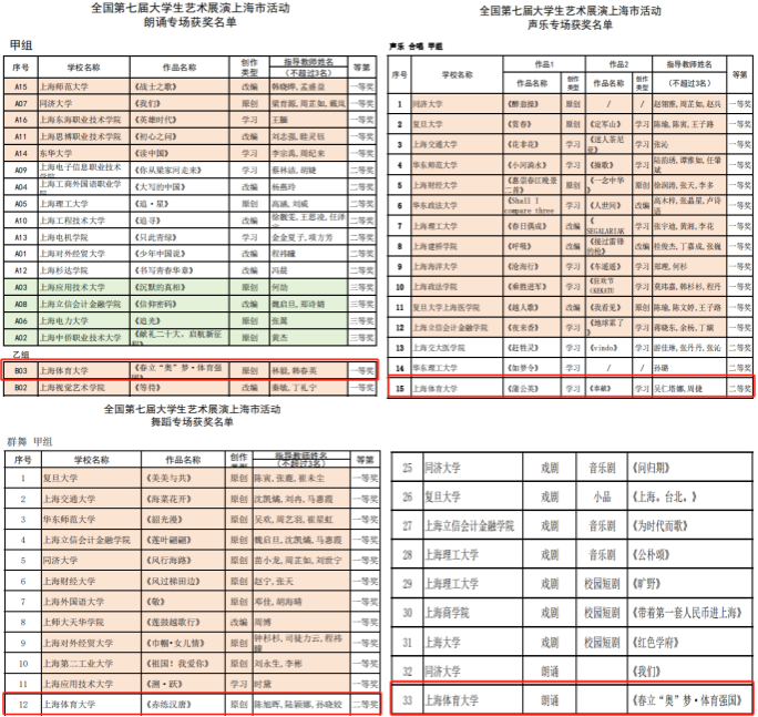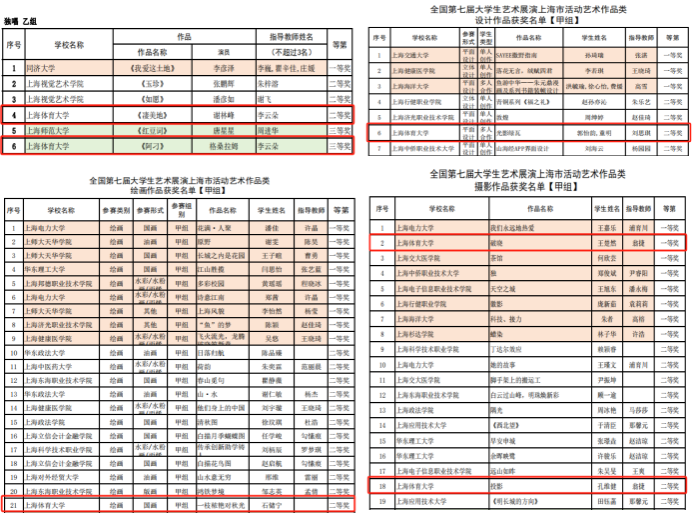 独唱.乙组(李云朵指导:《凄美地》和《阿刁》)分别获得上海市二等奖和三等奖;设计作品.甲组(刘思琪指导:《光影绿瓦》)获上海市二等奖;绘画作品.甲组(石储宁学生:《一枝秾艳对秋光》)获上海市二等奖;摄影作品.甲组(翁捷指导:《破晓》和《投影》)分别获得上海市一等奖和二等奖。参赛师生从筹备到排练、演出,克服了课程、专业训练等困难,刻苦训练,在经历中成长,在磨砺中蜕变。