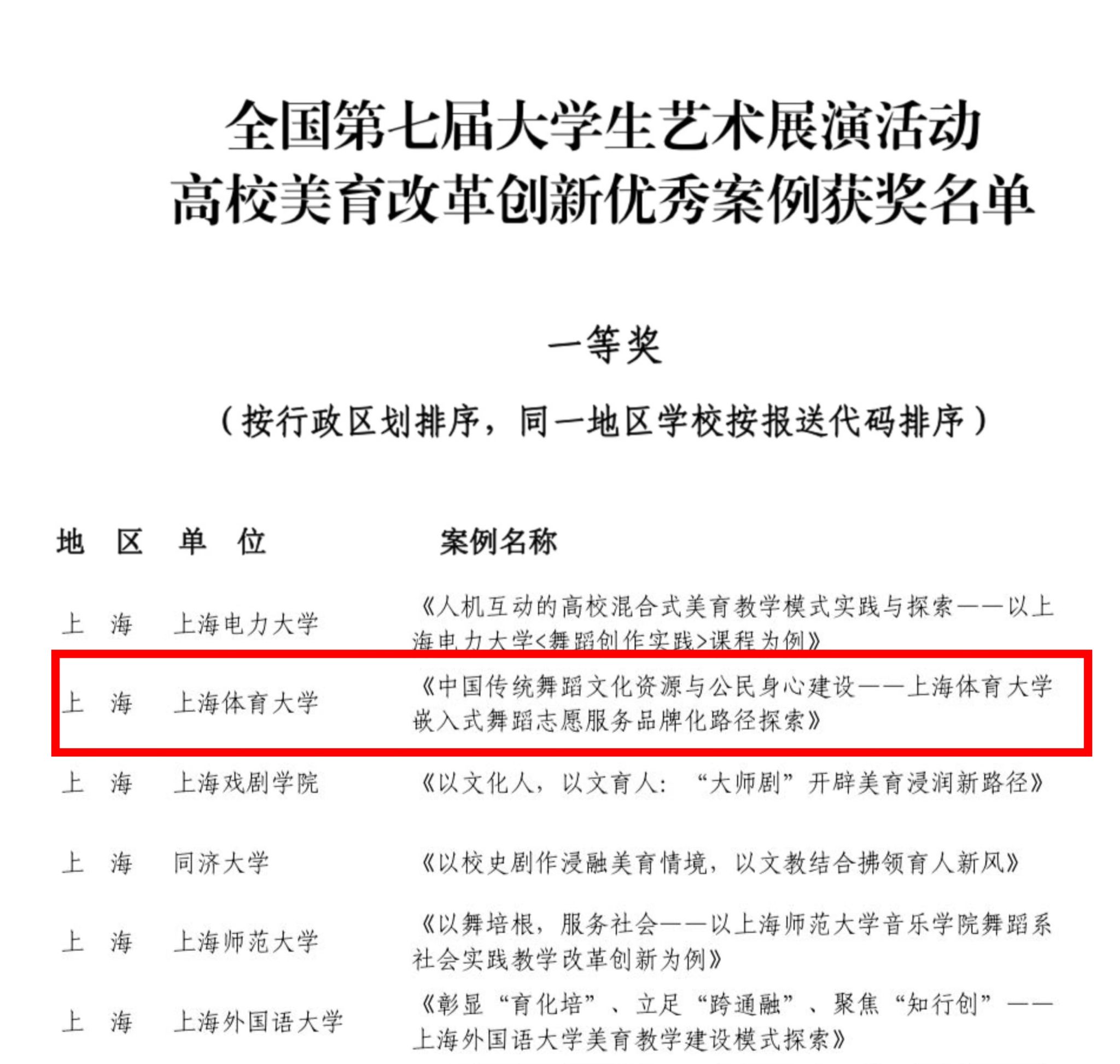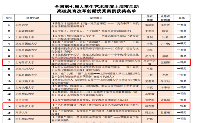 在全国第七届大艺展上海市展演中,高校美育改革创新优秀案例(马古兰丹姆、王丽娜:《中国传统舞蹈文化资源与公民身心建设一伟德源自英国始于1946嵌入式舞蹈志愿服务品牌化路径探索》,该案例通过层层评选推荐全国展演并荣获国家级一等奖;韩春英:《“艺科体传融合”理念下体育院校公共艺术课程改革的创新与实践》)获上海市一等奖。两个案例依托体育和舞蹈为技术支撑,充分挖掘艺术文化资源,构建具有体育特色的艺术服务社会的创新实践。