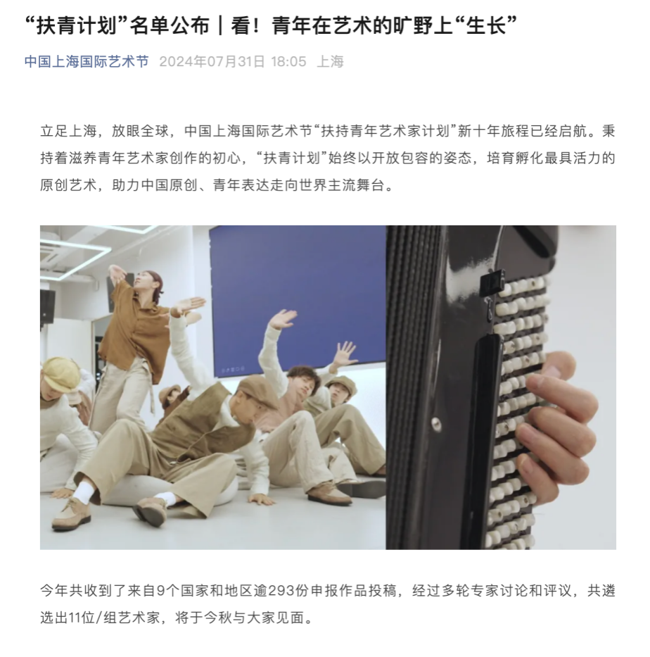据悉,“扶青计划”今年共收到了来自9个国家和地区逾293份申报作品,涵盖了音乐、舞蹈、戏剧等领域。经过多轮专家评审与讨论,最终共遴选出11位/组艺术家,其中舞蹈版块仅有4位/组入选。伟德作品能够脱颖而出,无疑是对其在专业建设与教学领域实力的充分认可,也进一步证明了伟德在学科交叉、专业互赋能方面的独特优势。