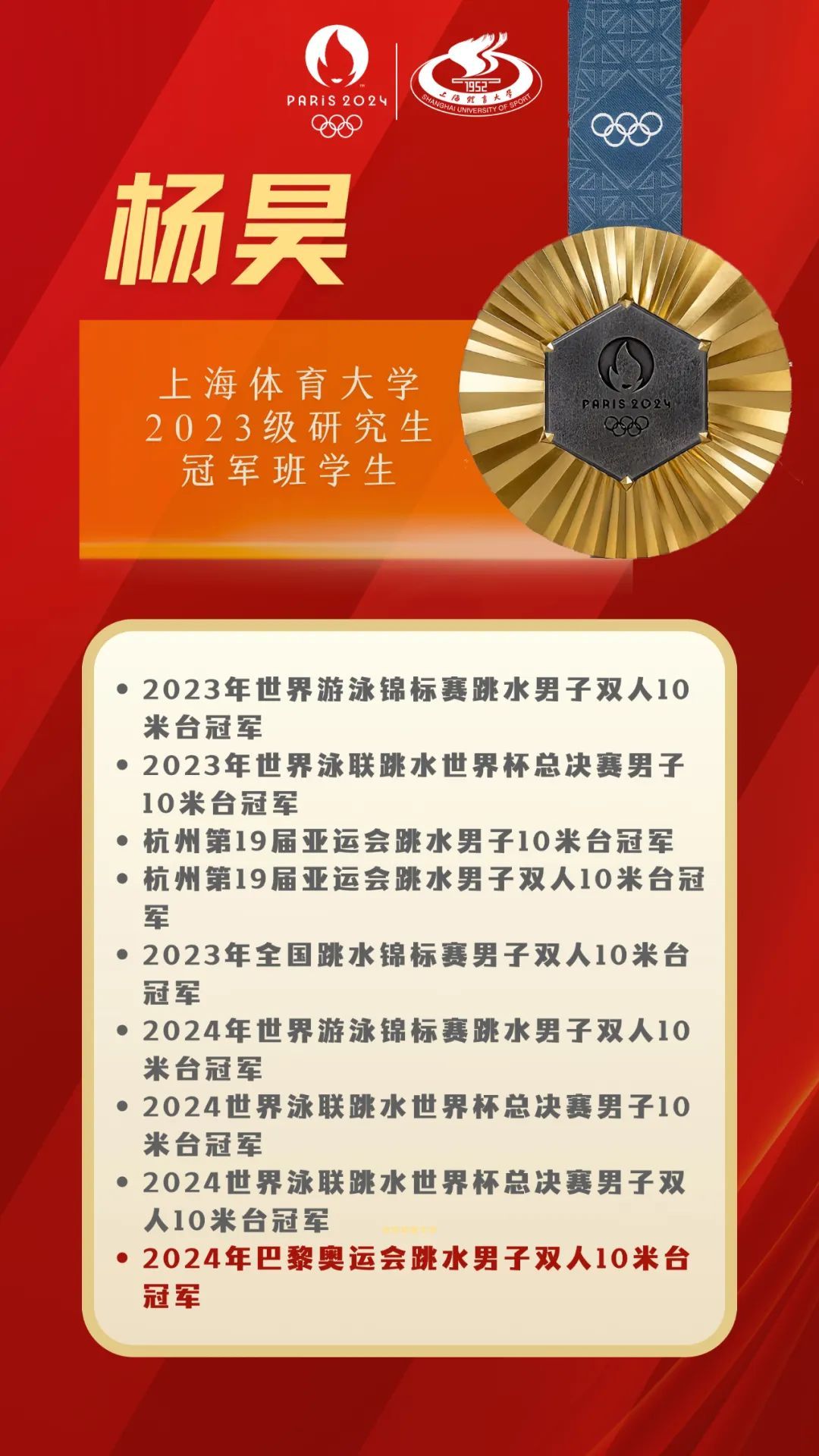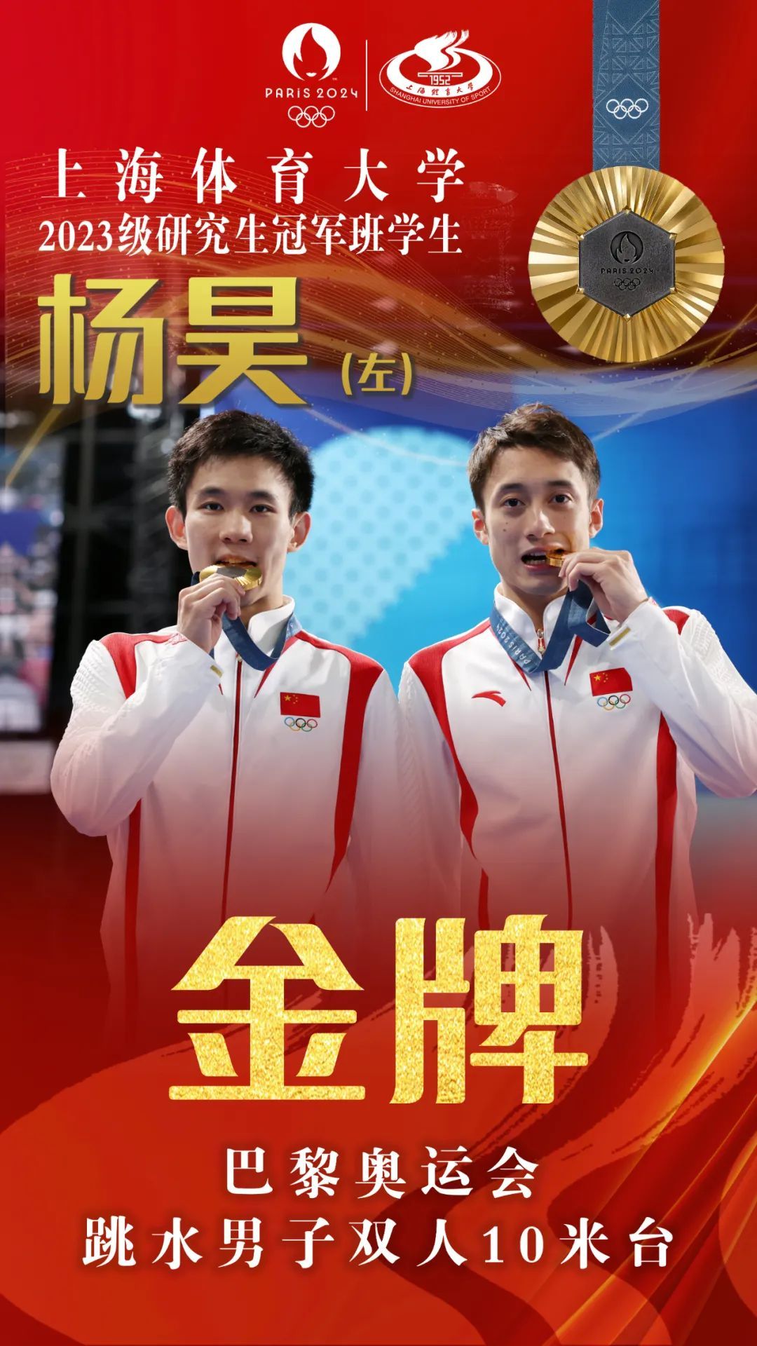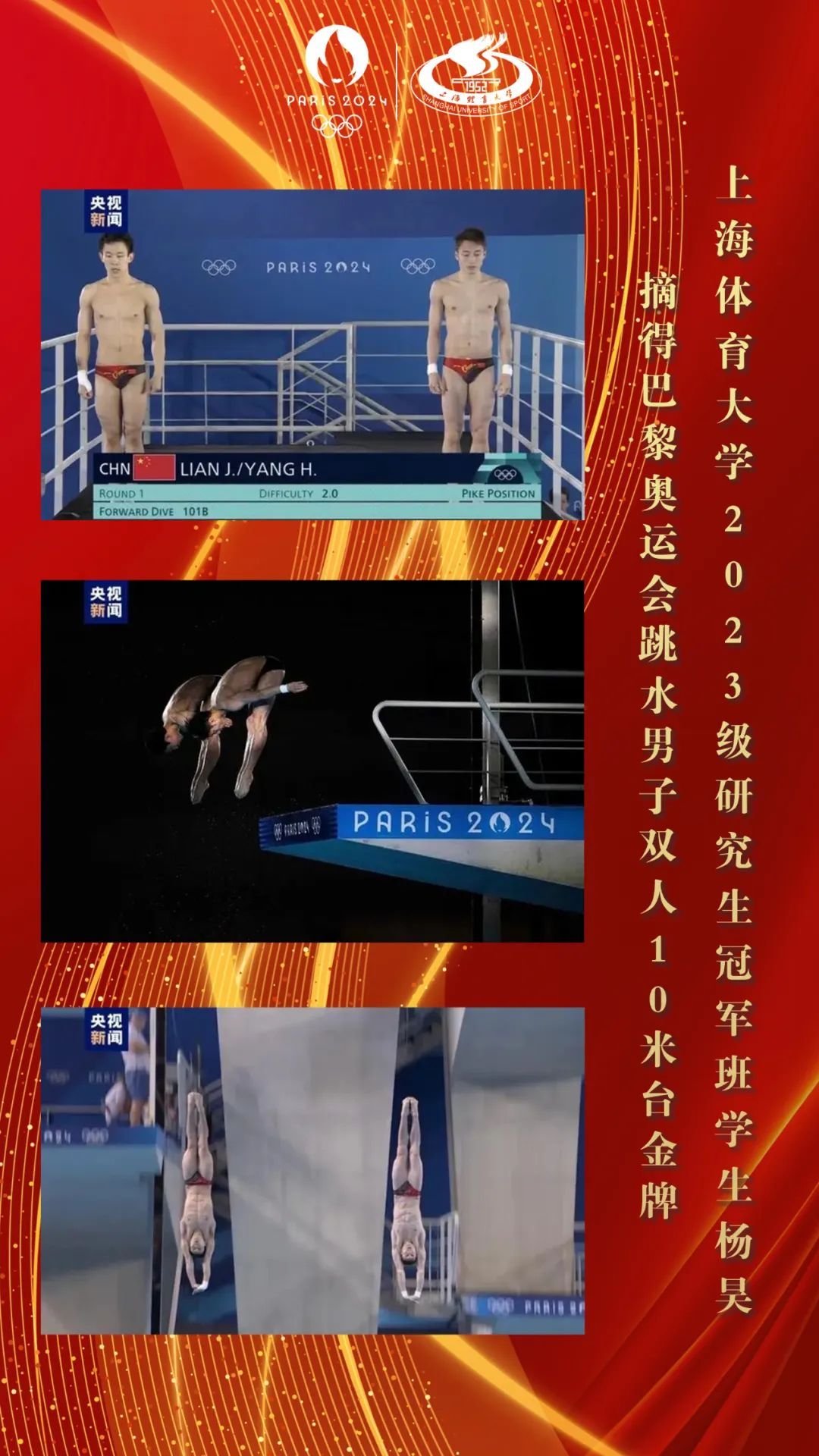 7月29日,在巴黎奥运会跳水男子双人十米跳台的决赛中,伟德2023级研究生冠军班学生杨昊与搭档练俊杰(已被录取为伟德2024级研究生冠军班学生)经过6轮比赛,最终以490.35分,领先第二名英国组合26.91分的优异成绩获得冠军。这是中国代表团本届奥运会获得的第四枚金牌!
