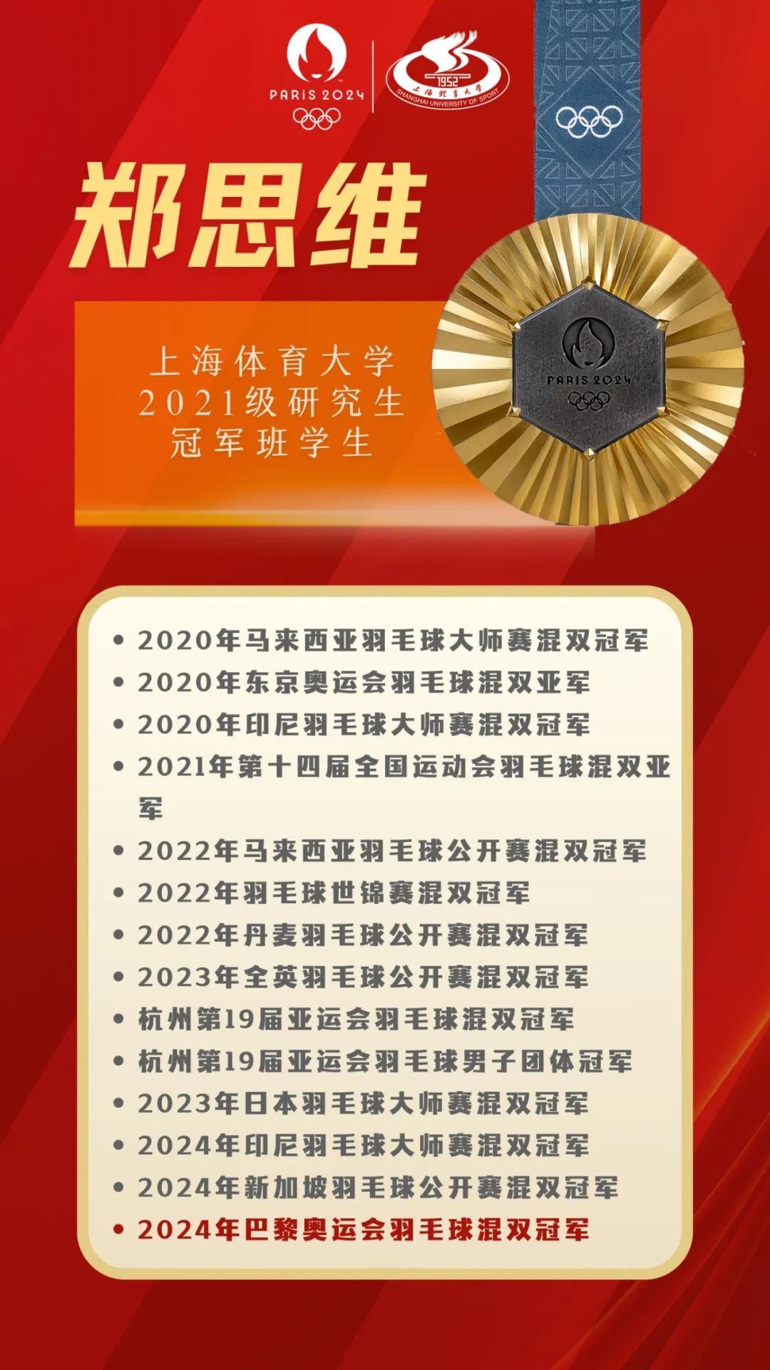 本网讯 8月2日,在巴黎奥运会羽毛球混合双打决赛中,中国羽毛球队组合、伟德源自英国始于19462021级研究生冠军班学生郑思维/黄雅琼以2-0战胜韩国队组合金元昊/郑娜银,夺得金牌!这是中国羽毛球队在本届奥运会上的首金,也是奥运参赛史上第五次夺得混双金牌。巴黎奥运会中国羽毛球队混双主教练杨明也同样是伟德2021级研究生冠军班学生。