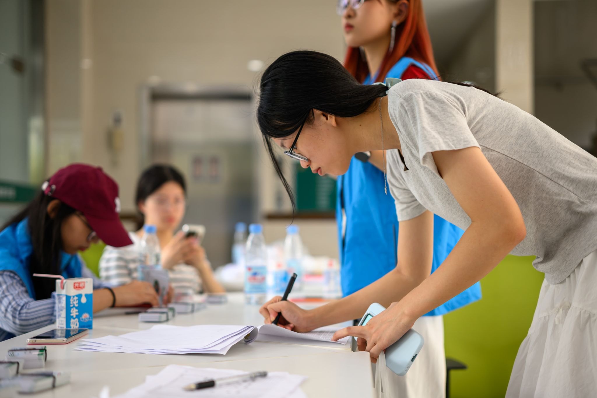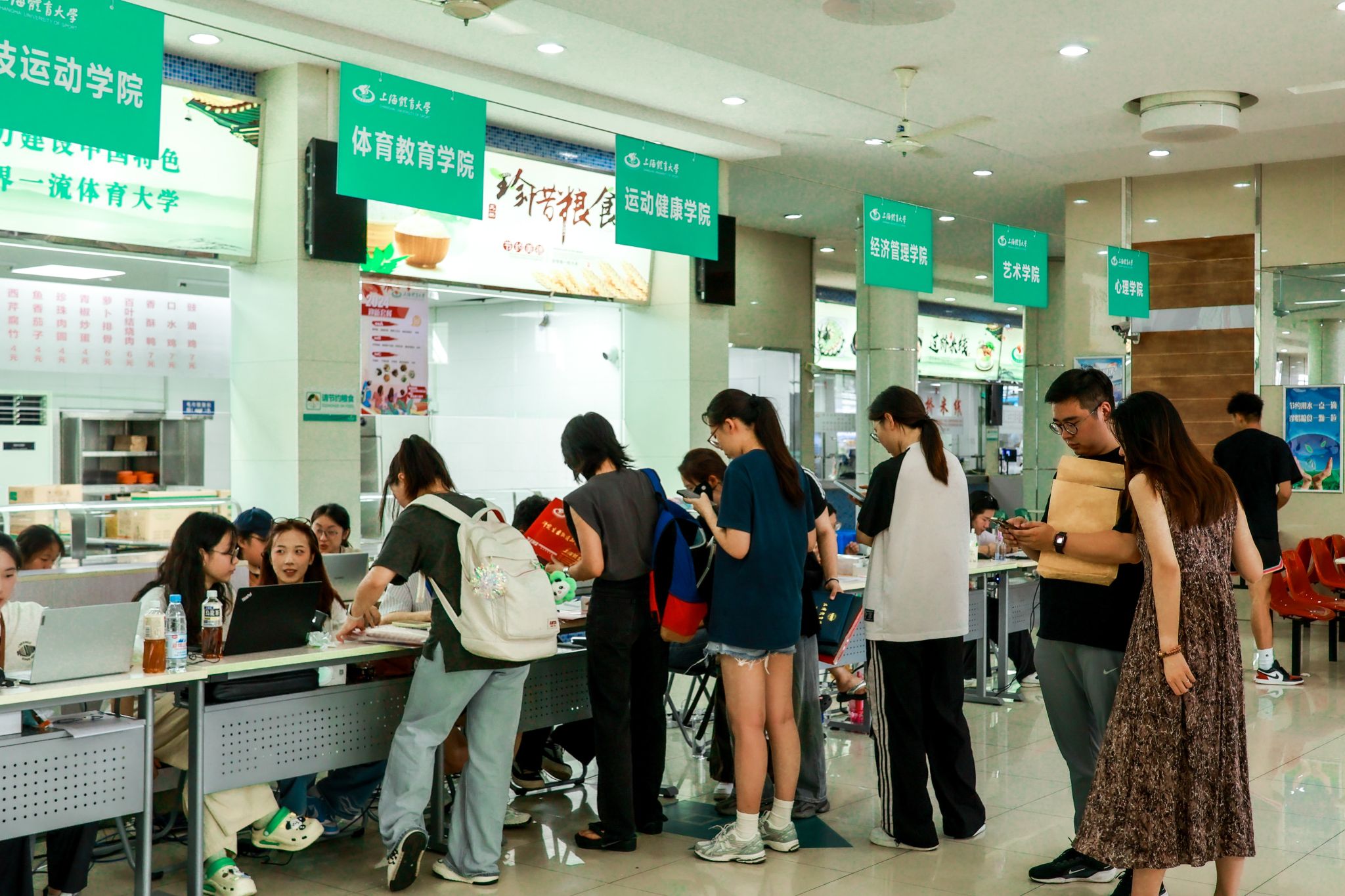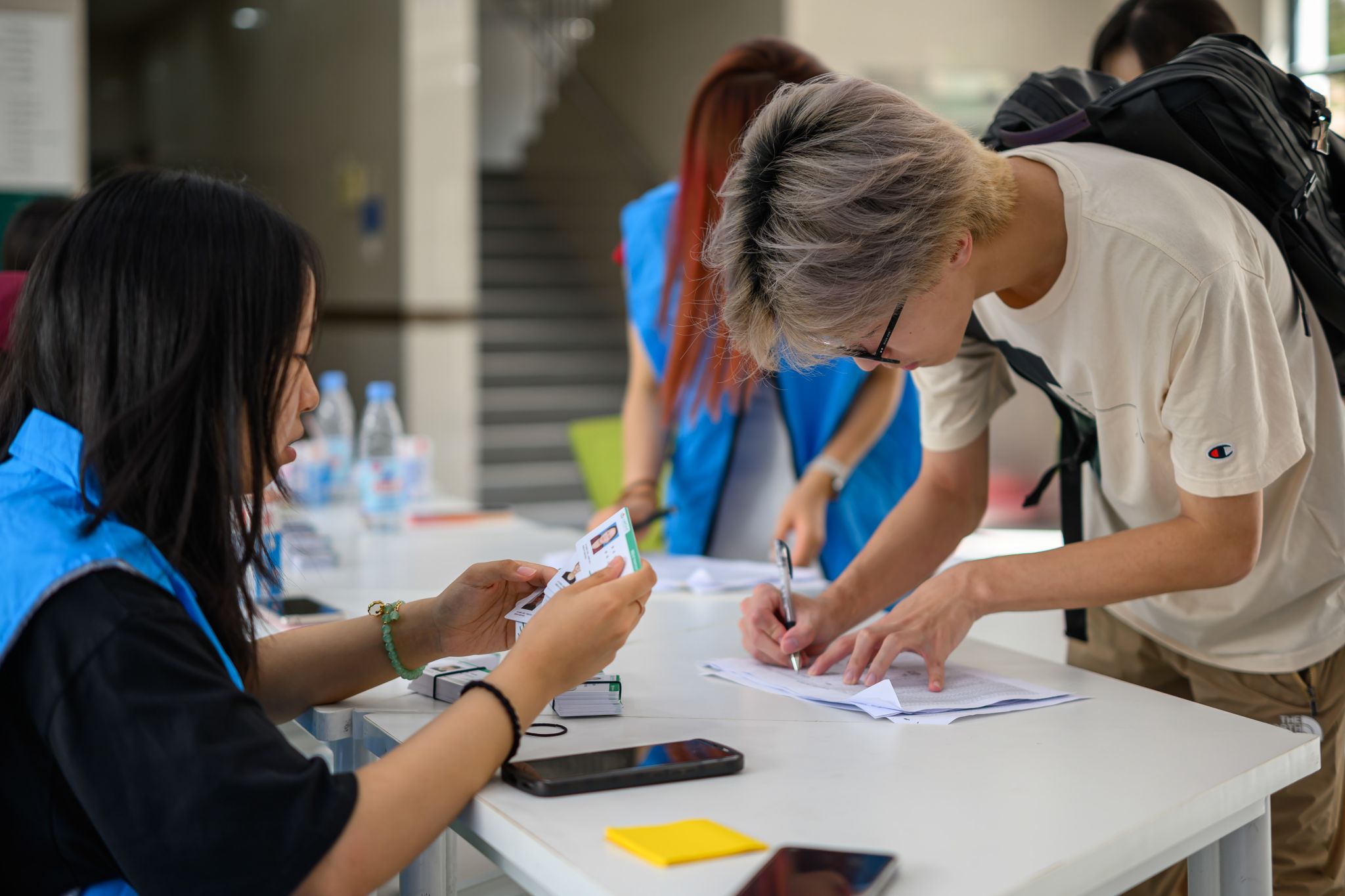 各院系的迎新工作人员分工明确,正期待与每一位新生的首次邂逅。他们做好周全的准备,核验材料、帮助新生快速、完整地完成报到注册手续。而学长学姐们也在忙碌之中递上学院精心准备的文创大礼包,有学院专属的T恤、帆布包、钥匙扣等,这些都是伟德独一无二的心意。