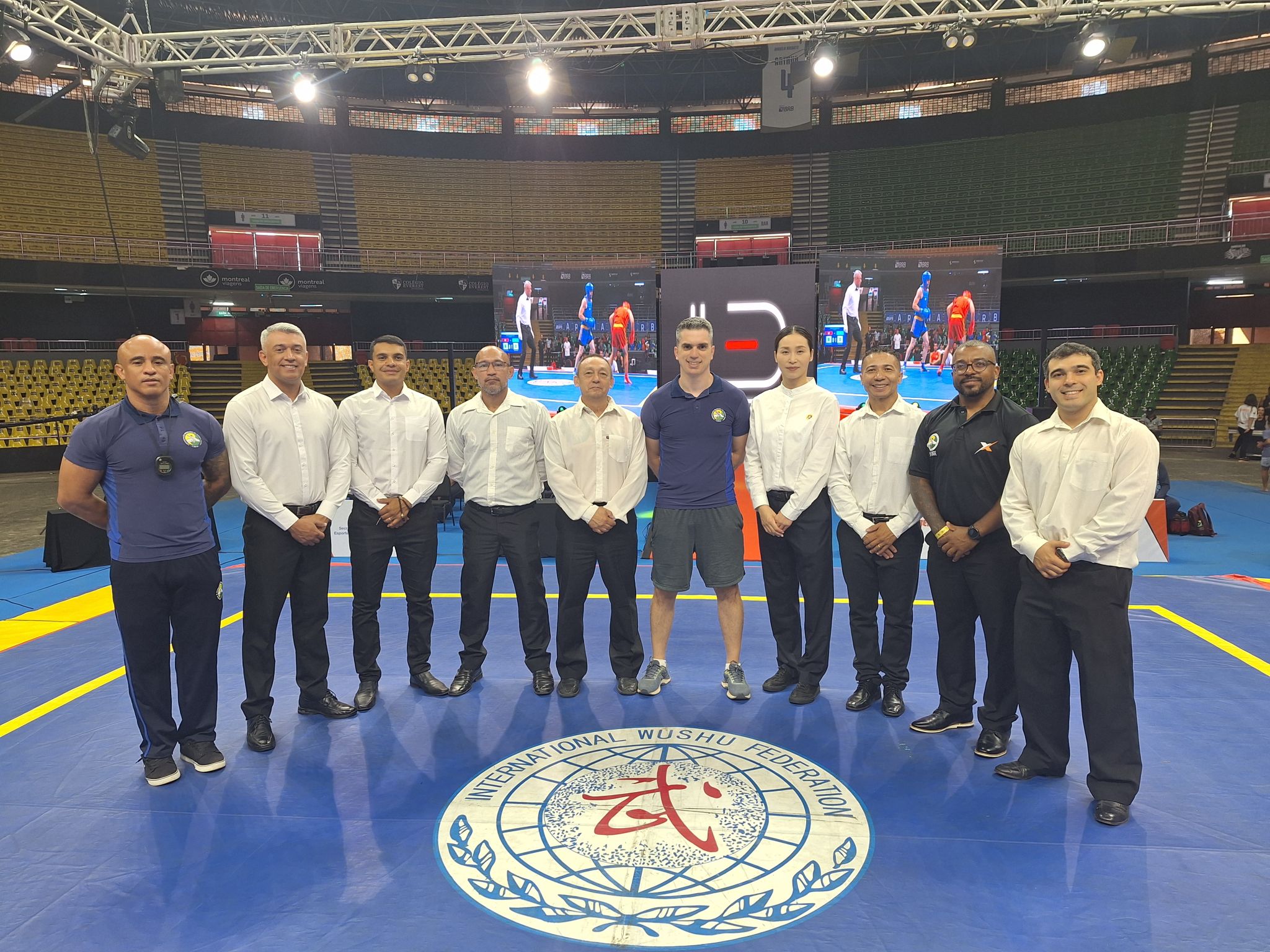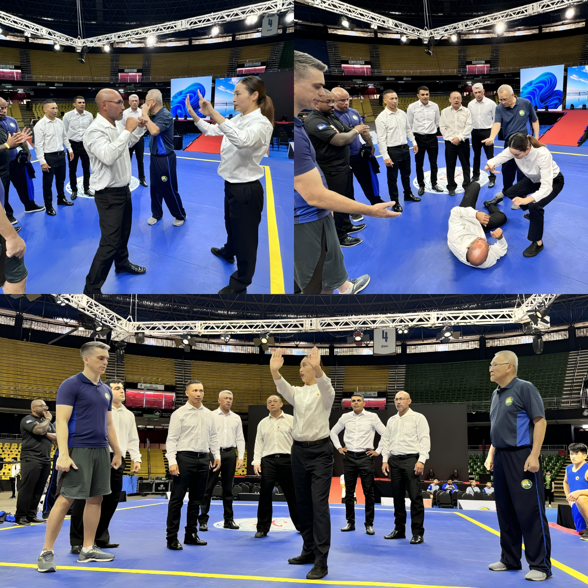 出访期间,周田芬副教授以专业的武术散打理论实践知识和丰富的国际赛事执裁经验,为中拉武术散打对抗赛的赛事组织进行了全方位的专项指导。同时,为参与此次武术散打比赛的裁判员耐心讲解了国际武术散打竞赛规则与裁判法的相关内容,全面涵盖了规则解读、裁判员规范手势与口令以及临场实践等多个环节,通过生动的讲解和实例分析,深入浅出地传授了武术散打项目执裁过程中的重难点,帮助提升了裁判员的业务能力和实战水平。在中拉武术散打对抗赛的比赛过程中,作为场上裁判,她凭借丰富的执裁经验、敬业的裁判精神,严格维护比赛规则,公平公正执裁,充分展示裁判员的专业素养,助力本次赛事顺利进行。