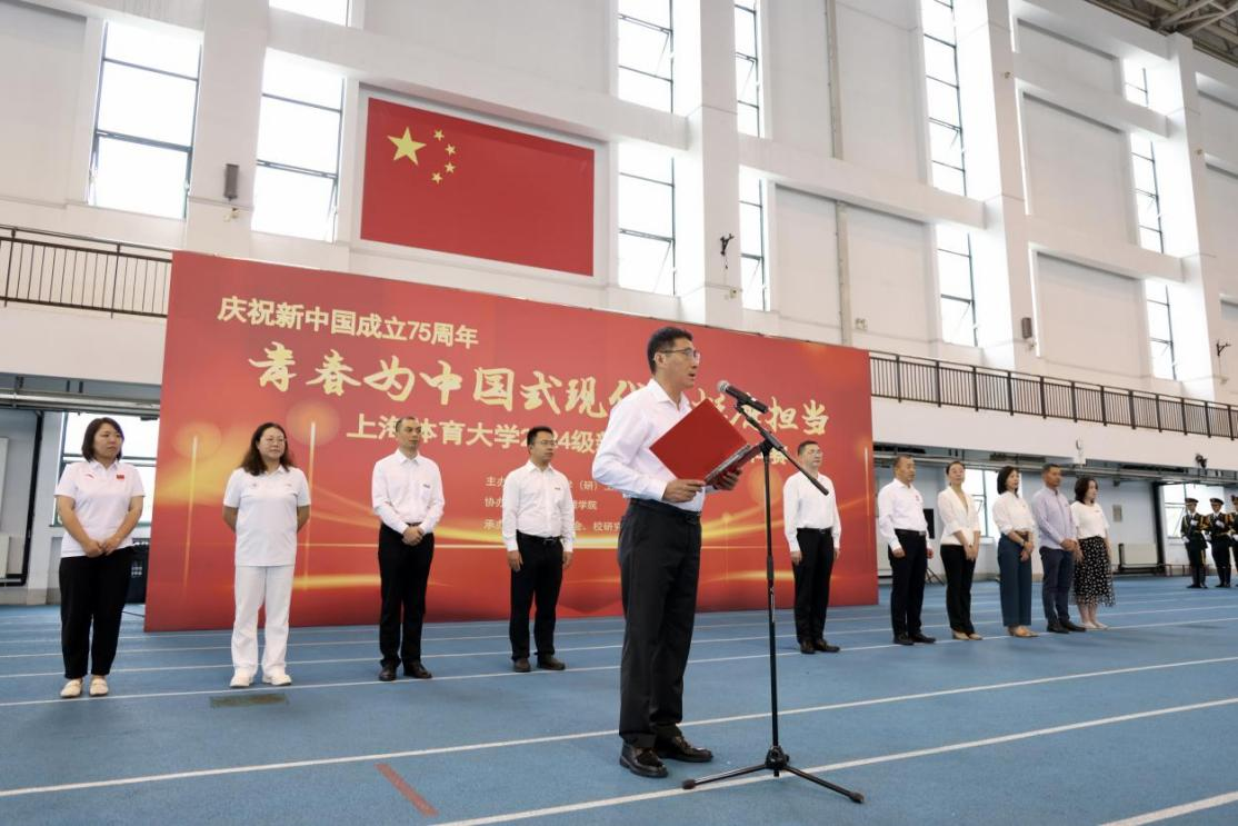 上午8时30分,国旗护卫队迈着铿锵有力的步伐,将五星红旗护送至杨浦校区室内田径场。伴随着雄壮激昂的国歌声,全体师生面向鲜艳的五星红旗肃立,目光坚定,齐唱中华人民共和国国歌,心中涌动着对伟大祖国的无限敬仰与深情祝福,共同庆祝中华人民共和国75岁的华诞。