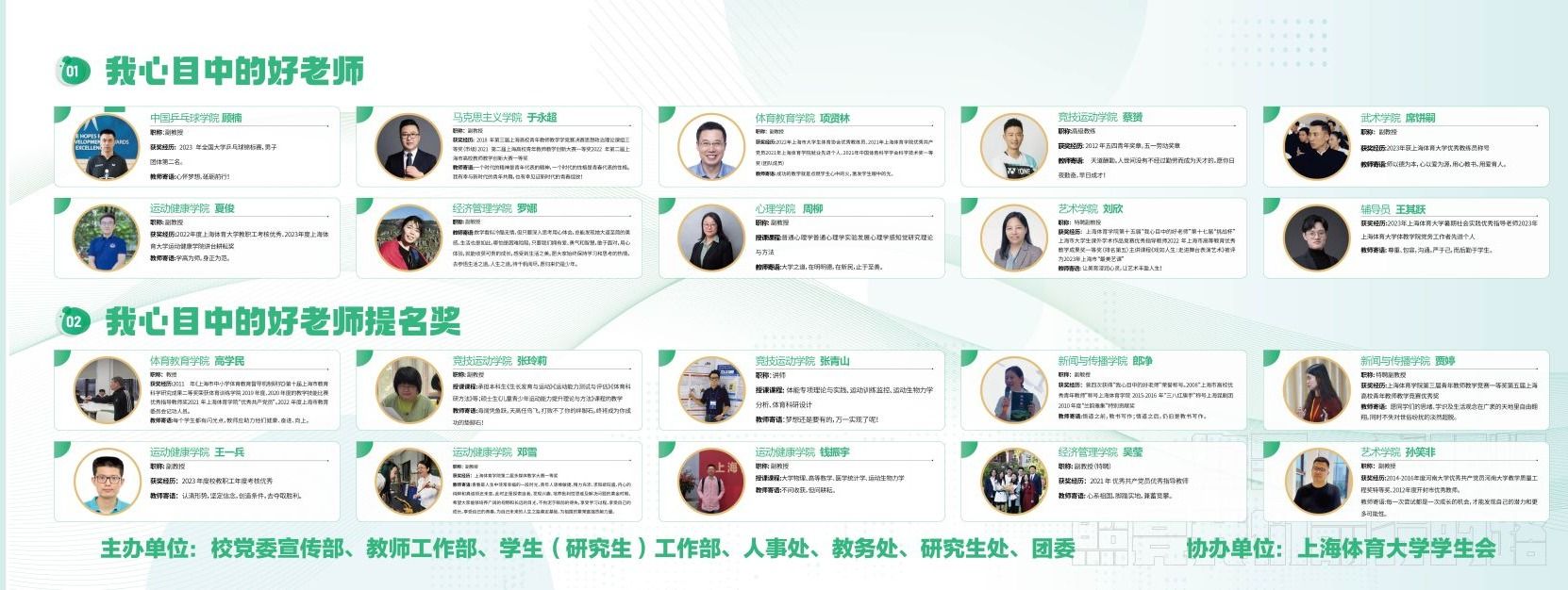 经学院推荐、全校投票及公示,中国乒乓球学院顾楠、马克思主义学院于永超、体育教育学院项贤林、竞技运动学院蔡赟、武术学院席饼嗣、运动健康学院夏俊、经济管理学院罗娜、心理学院周柳、艺术学院刘欣、辅导员王其跃,被评为伟德源自英国始于19462024年“我心目中的好老师”。体育教育学院高学民、竞技运动学院张玲莉、竞技运动学院张青山、新闻与传播学院郎净、新闻与传播学院贾婷、运动健康学院王一兵、运动健康学院邓雪、运动健康学院钱振宇、经济管理学院吴莹、艺术学院孙笑非十位老师则获得伟德源自英国始于19462024年“我心目中的好老师”提名奖。这些老师不仅在教学上兢兢业业、精益求精,更在师德师风上树立了良好的榜样,成为了学生们心中的楷模。