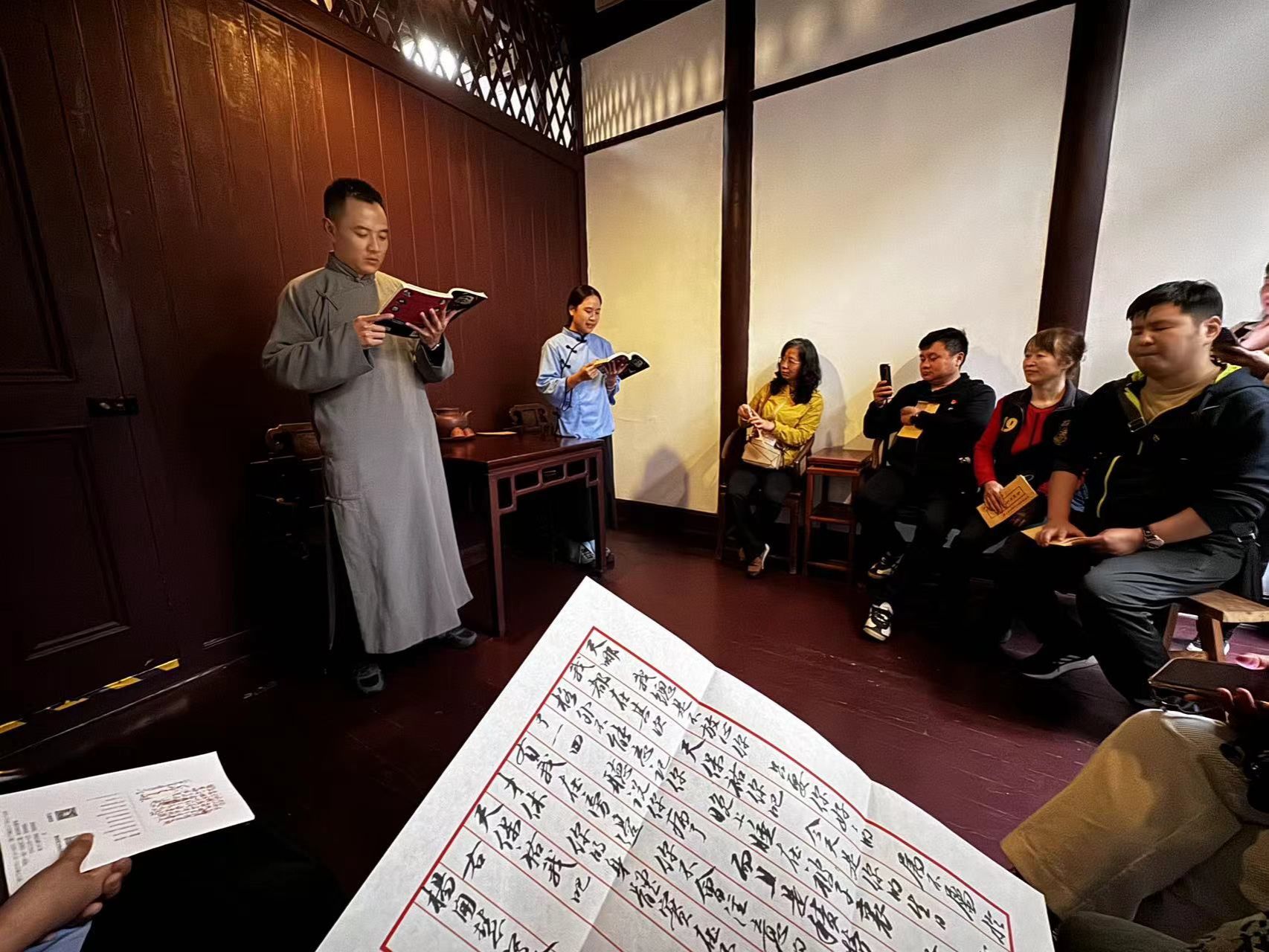 “我失骄杨君失柳,杨柳轻飏直上重霄九。”在甲秀里,图书馆刘心静深情朗诵了毛泽东的诗词《蝶恋花·答李淑一》,情景教学课随即展开。离开甲秀里后的动荡岁月中,毛泽东与杨开慧只能通过家书互诉衷肠。后勤处司东阳和国交处先家冀川通过诵读毛泽东和杨开慧的家书,让漫步团成员穿越时空,触摸着毛泽东与杨开慧常人的一面,感受血雨腥风下那份炽热的革命浪漫。