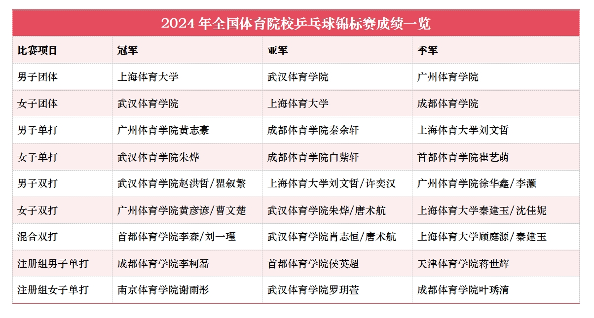 2024年全国体育院校乒乓球锦标赛分为男子团体、女子团体、男子单打、女子单打、男子双打、女子双打、混合双打、注册组男子单打和注册组女子单打九个项目的比赛。经过四天的激烈角逐,本次赛事于11月28日下午顺利完赛,比赛现场气氛热烈非凡,各参赛队伍以“球”会友,互相鼓励、互相学习、共同进步,用积极向上的精神风貌为活动增色添彩,不同院校的同学们通过这次赛事结下了深厚的友谊。