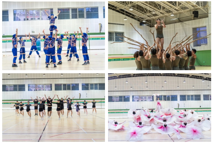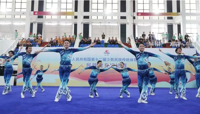 民族健身操项目由韩春英担任教练。节目巧妙地融合了经典的茉莉花与新疆民歌音乐,当熟悉的旋律响起,仿佛编织起了一幅连接东西部文化的绚丽画卷。在表演过程中,队员们将新疆舞蹈的热情奔放与江南水乡的柔美婉约完美结合,时而欢快地旋转跳跃,展现出边疆儿女的豪迈气概,时而轻盈地伸展身姿,演绎出江南少女的温婉细腻,寓意着民族文化的交往交流交融,生动地展现了各民族像石榴籽一样紧紧抱在一起的团结精神。