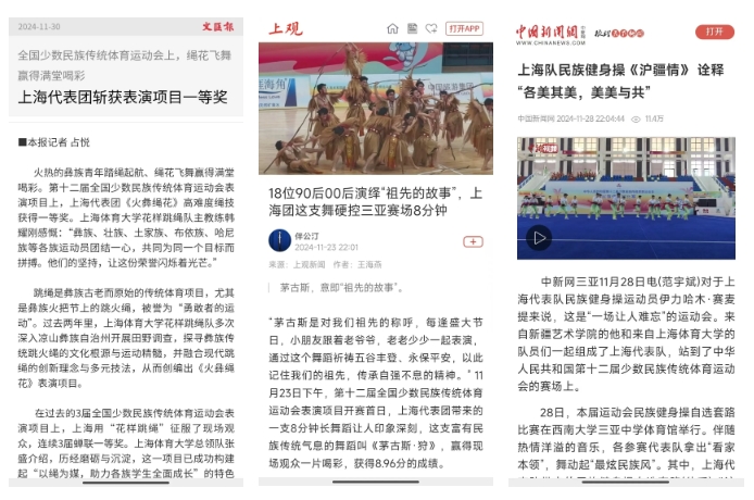 党委常委、统战部部长张盛在接受新华社采访时指出,全国少数民族传统体育运动会把文化、竞技和民俗融合起来,点燃了每一个人的乡愁,是增强学生文化自信最好的课程。民族健身操教练韩春英在向央视记者解读创编理念时说到,沪疆情深在项目展示中得到了充分的艺术展现,但更重要的是来自不同民族的学生真正感受到了各美其美、美美与共的深意。《茅古斯·狩》的编导彭涨老师在接受中国新闻网的报道中表示:“恰如我们的城市——上海,可回溯长江源头,又海纳百川,奔流到海。各民族同胞家在上海,在这里交往交流交融,最终融会贯通成国际化大都市,链接世界与未来。”从云南来上海求学的哈尼族女队员白凌璇同学在火彝绳花训练中化解了离乡的孤独,与队友的互动收获了满满归属感,她告诉记者:“尽管高强度的训练让身体倍感疲惫,但我不仅掌握了一项运动技能,更收获来自五湖四海、各个民族的队友,大家相互关爱、相互支持,亲如一家。”
