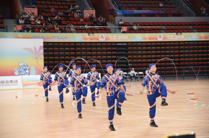 《火彝绳花》由韩耀刚担任教练。比赛现场,绳花飞舞,队员们默契配合,将传统与现代元素完美融合,淋漓尽致地展现了彝族文化特色,也展示出花样跳绳现代性转化的独特艺术魅力,一束绳花跳出民族大团结,赢得了全场评委的高度认可和观众的热烈掌声。