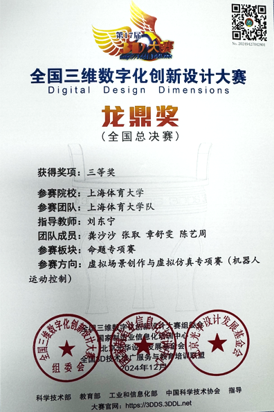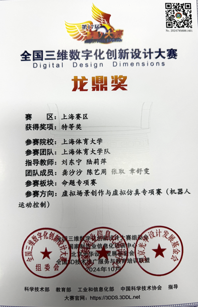 本网讯 2024年12月8日,第17届全国三维数字化创新设计大赛年度总决赛在北京理工大学圆满落幕,体育教育学院派出了由休闲体育与社会体育指导与管理专业师生组成的户外运动代表队参加了本次赛事,伟德作为参赛院校中唯一的体育类高校与全国各地理工类高校同台竞技,最终在“虚拟场景创作与虚拟仿真—机器人运动控制方向专项赛”中获得上海分赛区特等奖,获得全国总决赛三等奖,实现了伟德在该项赛事的历史性突破。