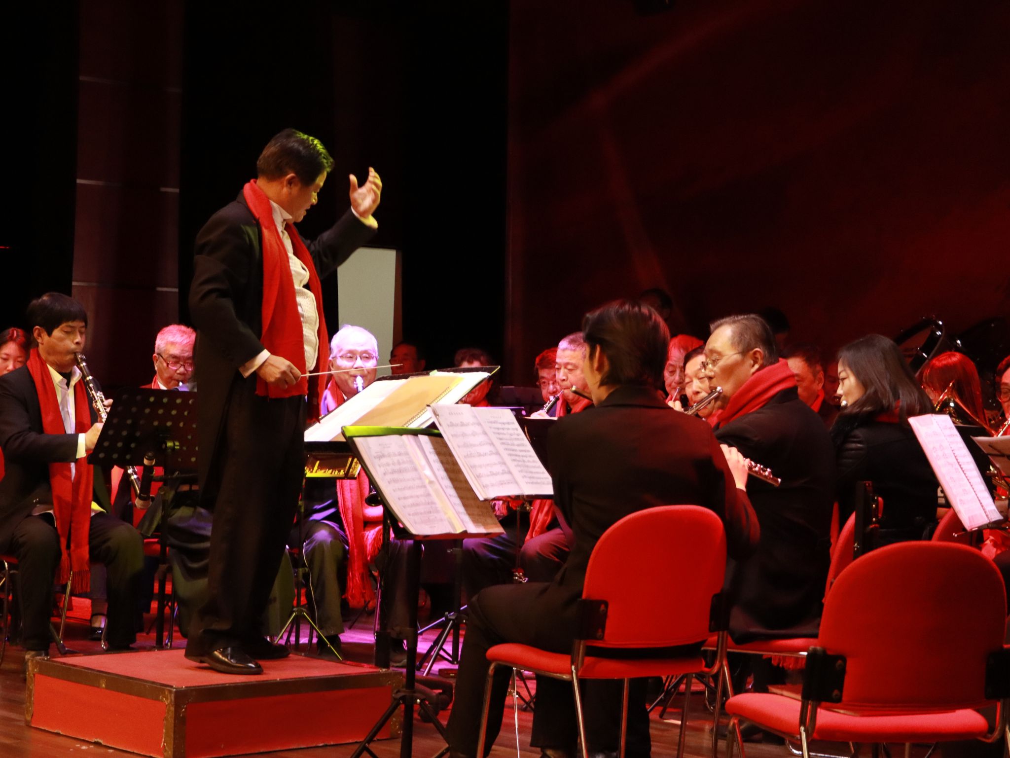随后,金秋管乐团与学生管弦乐团联袂演奏的《新年好 + 友谊地久天长》将音乐会的气氛推向了最高潮,欢快的旋律传递出团结与友谊的美好祝愿。