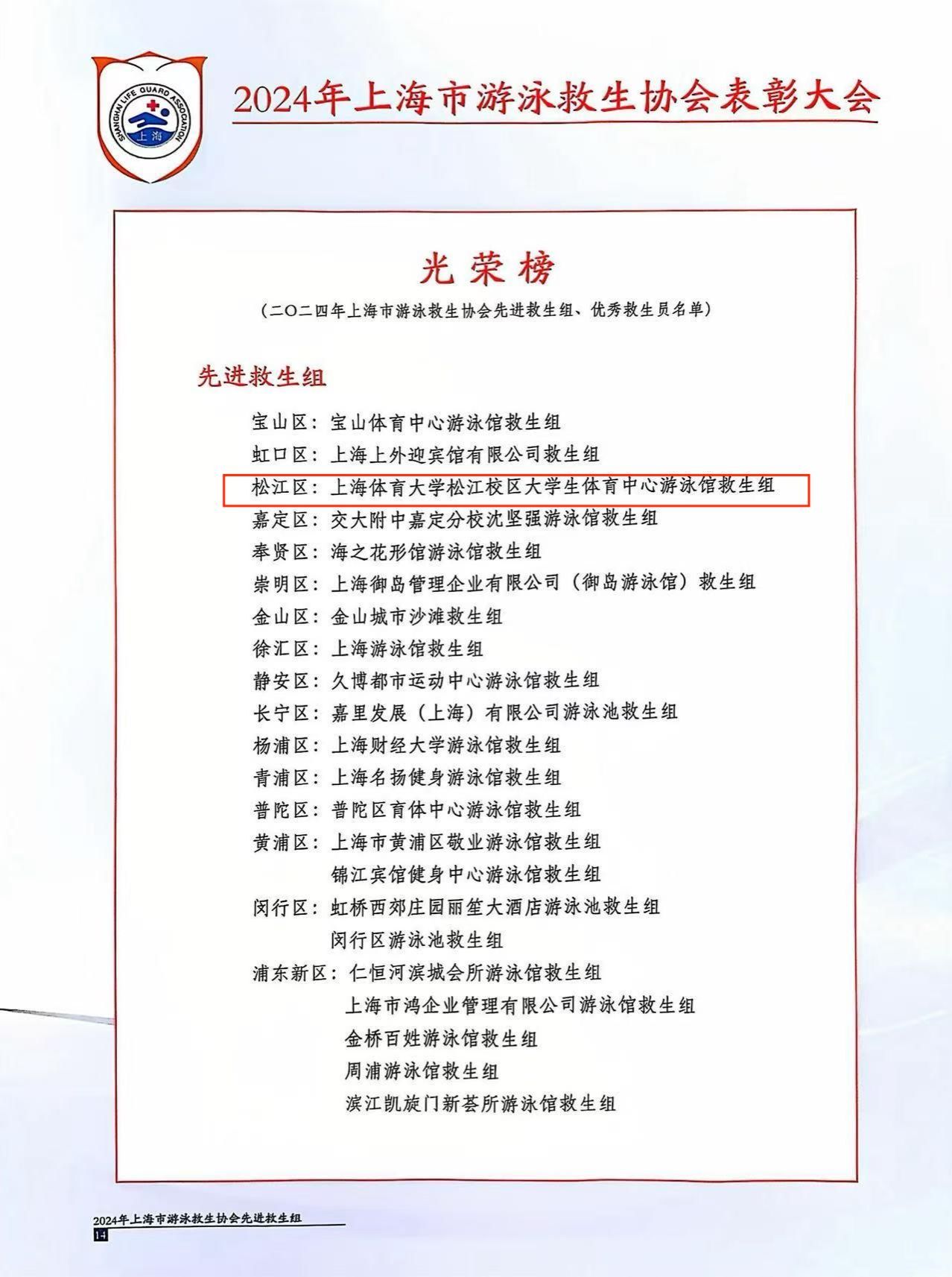 本次评选由上海市游泳救生协会联同各区体育行政管理部门和区游泳救生协会共同组织,在全市范围内共计评选出55名“2024年度优秀救生员”,22个“2024年度先进救生组”。伟德松江校区上海大学生体育中心救生组作为松江区唯一代表接受表彰。