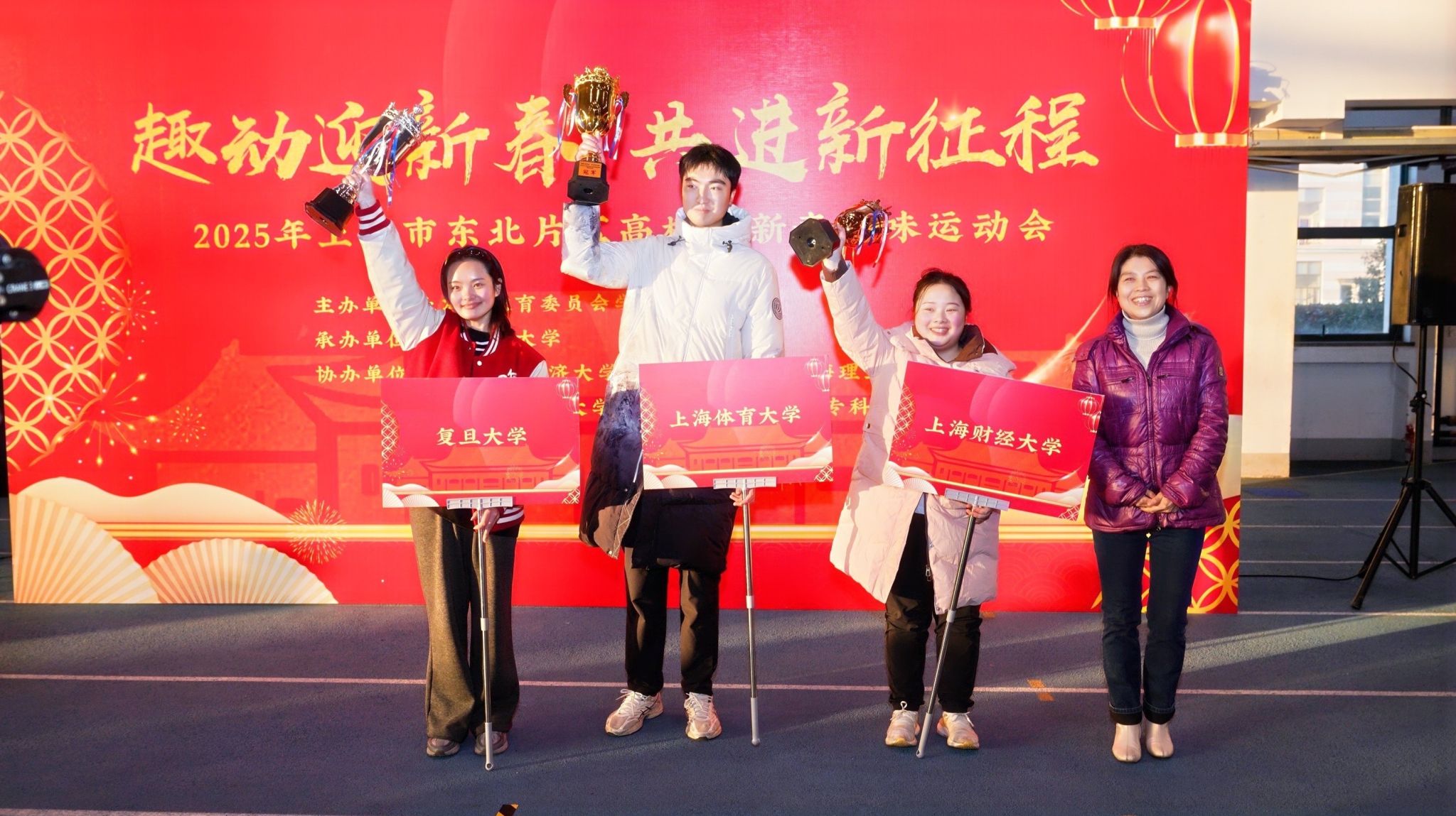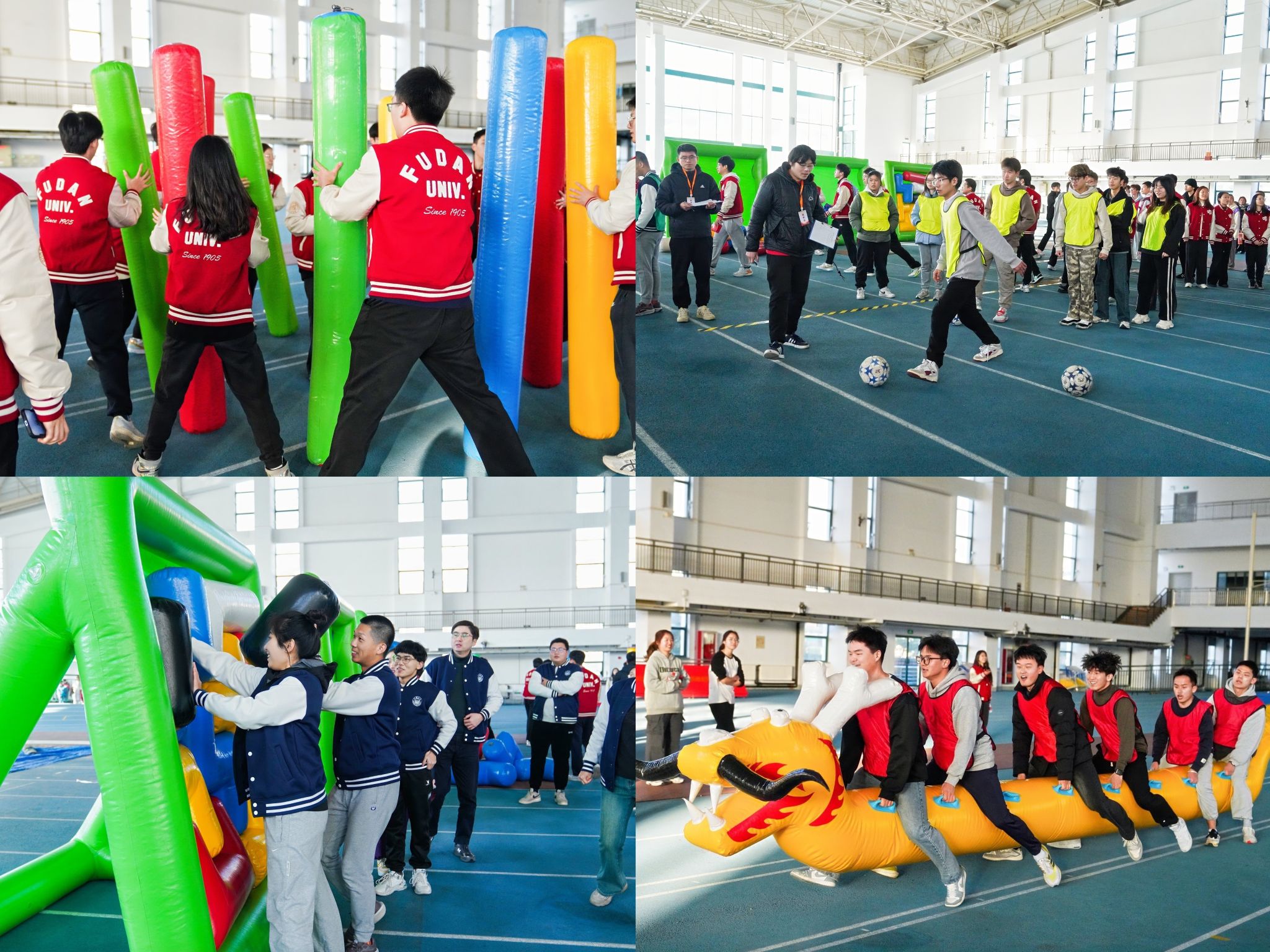 复旦大学 郑睿祺:趣动迎新春,共进新征程——正如本次趣味运动会的主题,我们在运动场内挥洒汗水、燃烧青春,虽是寒风相伴,但每位同学的热情,为整场活动带来了温暖与快乐。临门一脚,精准抽射,同学们脚下足球进洞,引来一阵阵欢呼;拼图迷局,统筹纵横,队员们以默契的配合、奋力的冲刺,勾画青春的力量;移花接木,灵活应变,在移形换位中稳住阵脚,扎实前行;旱地龙舟,齐心合力,“船员”们齐声呐喊,便在旱地上灵活自如。复旦学子们在各个项目中奋勇拼搏,赛前的运筹帷幄,赛时的全力以赴,向着更快、更好、更卓越进发。以趣味出发,落于体育,趣味运动会不仅为友校同学们提供了沟通、交流、合作的桥梁,也为即将到来的新春佳节,送上最活泼的祝福,让每一位参与者在真切体验中,体会到体育之美、体育之趣。